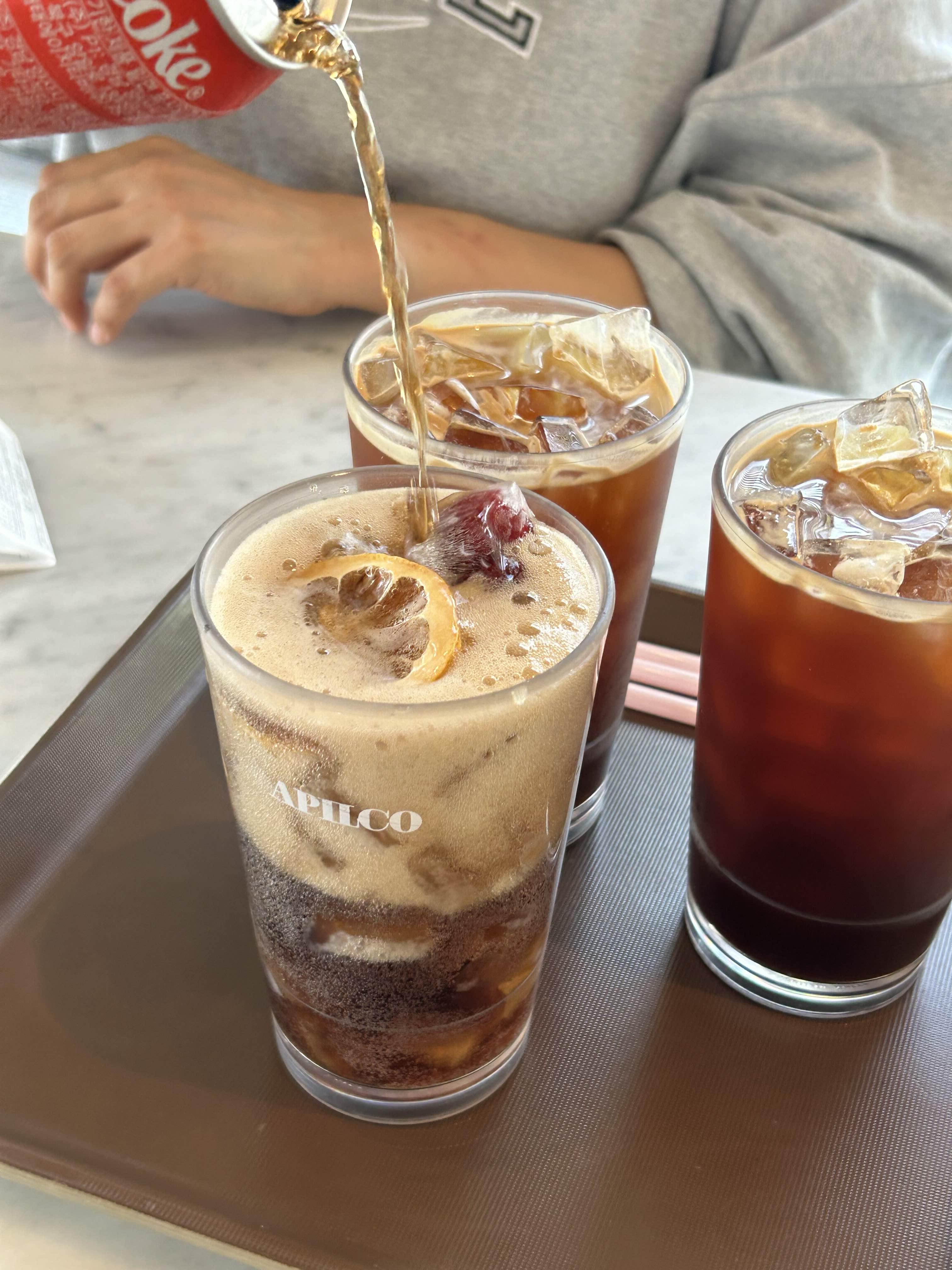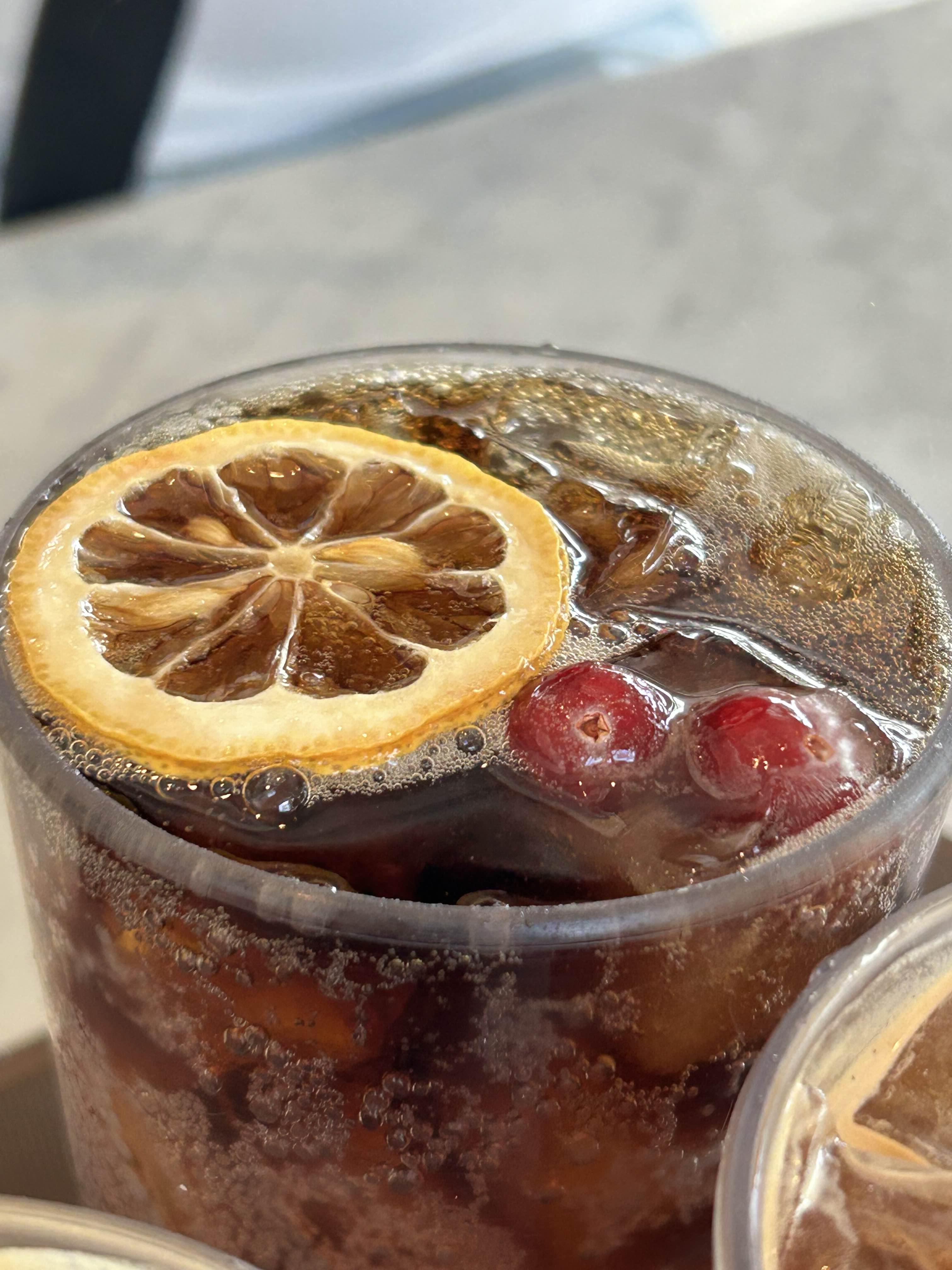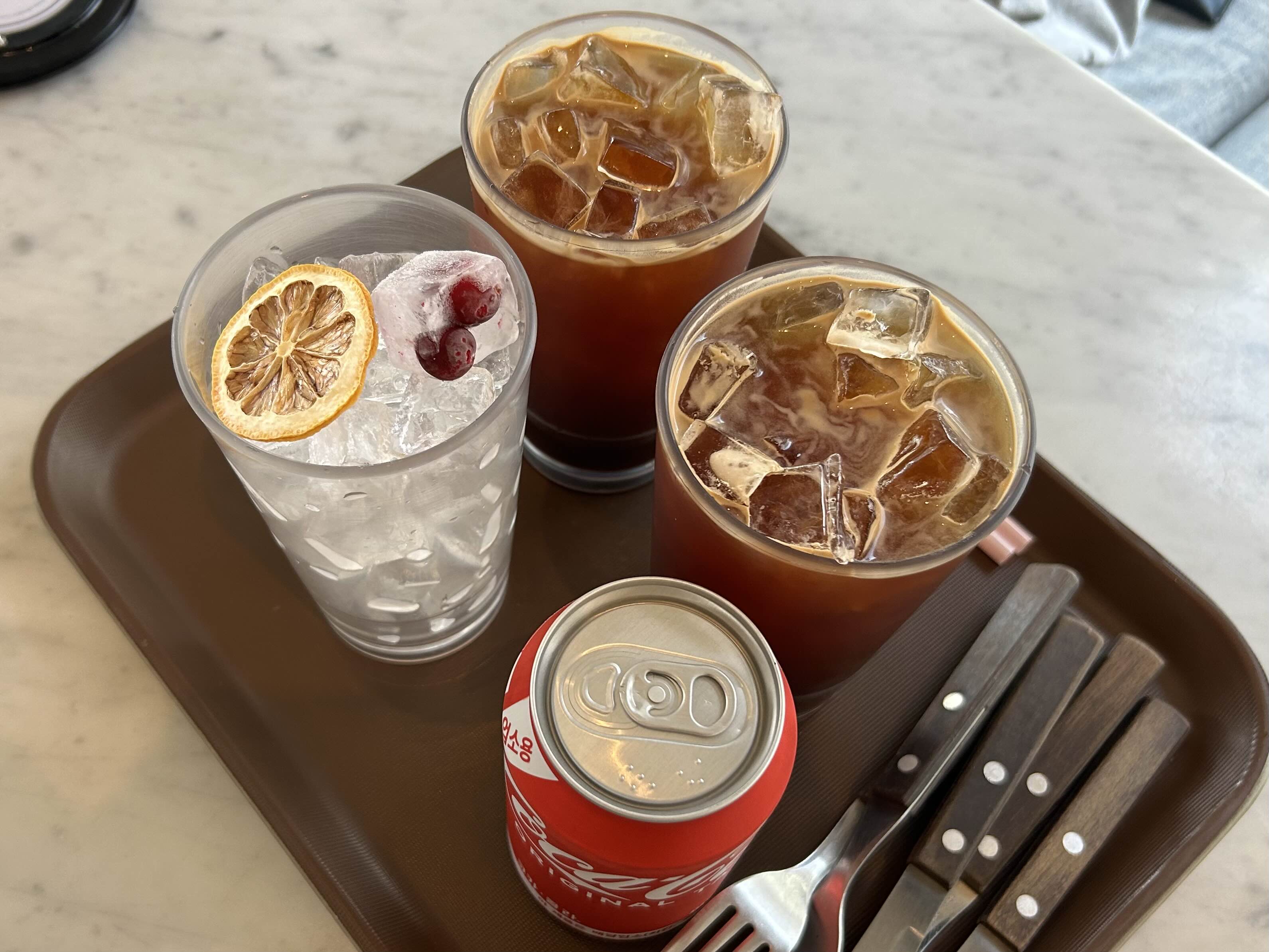 먼저 주문한 커피와 콜라가 나왔습니다. 콜라에 따라먹을 얼음을 주시는데 과일얼음 한조각과 건조된 오렌지로 센스를 더해주세요.