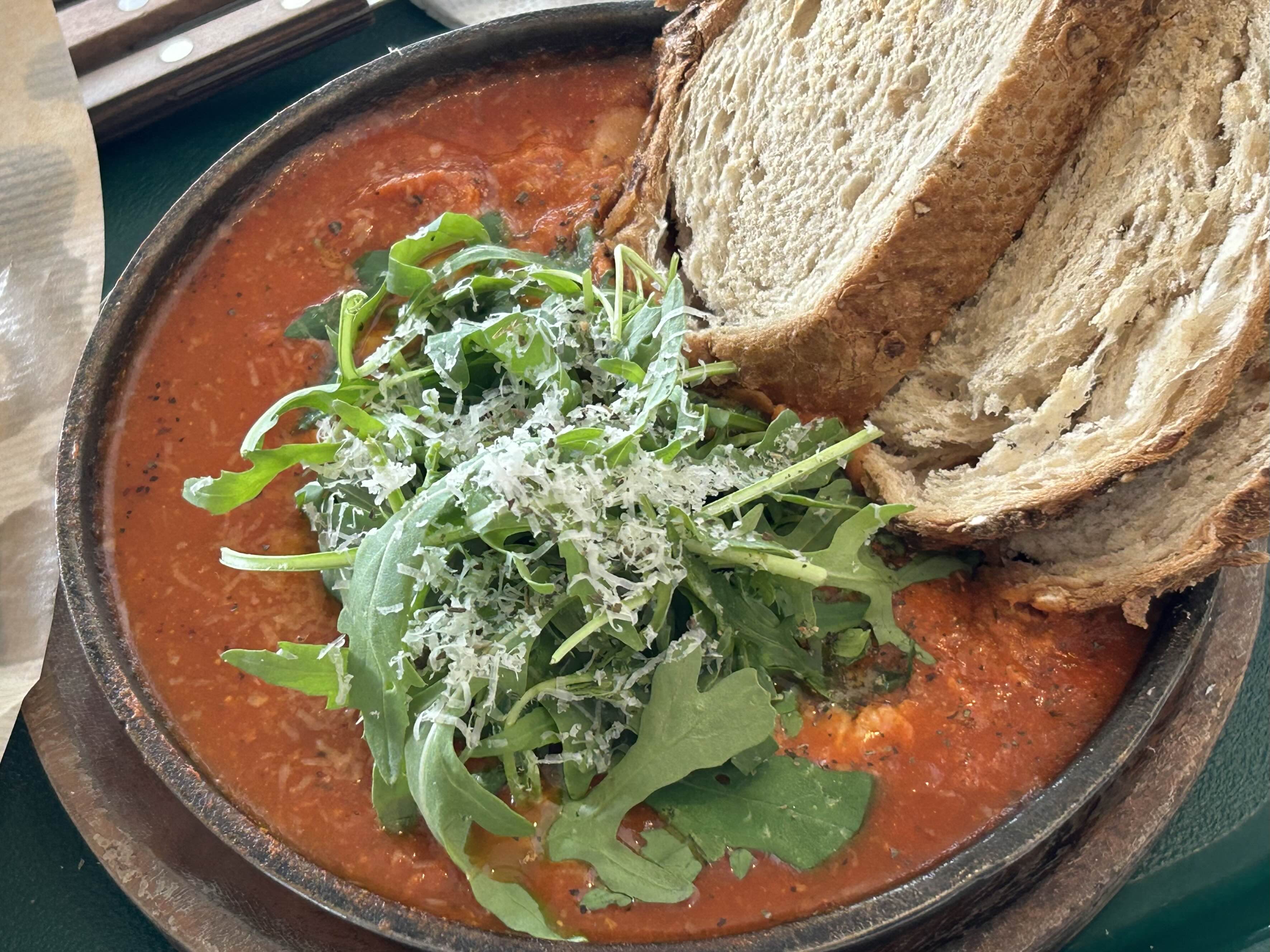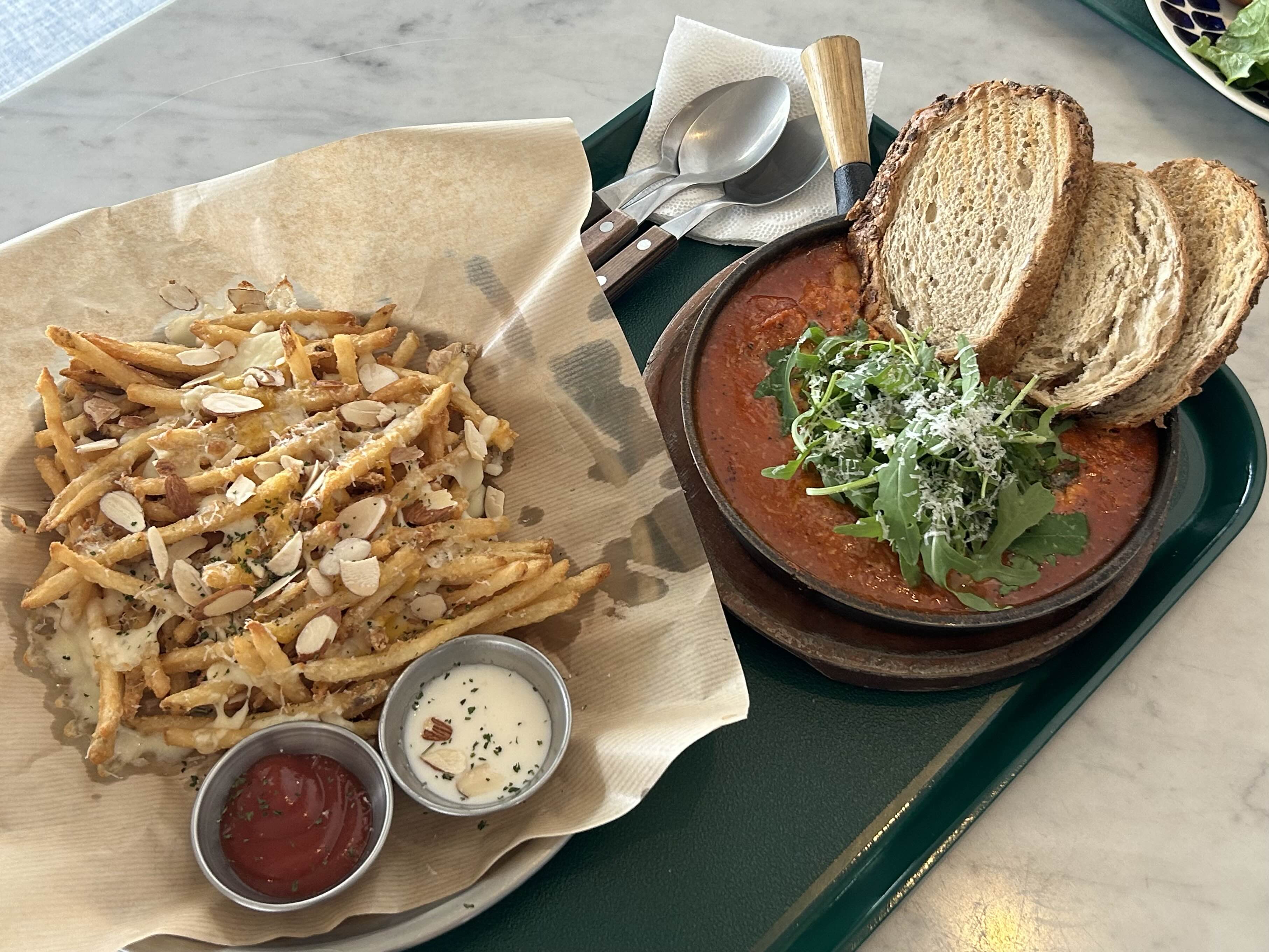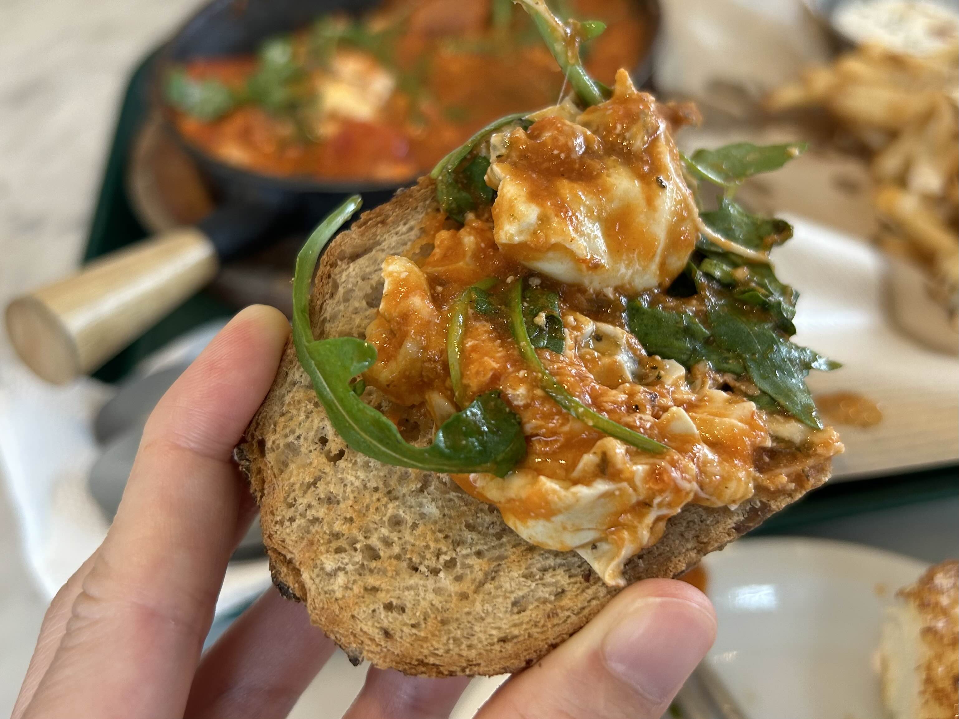주문한 메뉴가 드디어 나왔습니다. 감자튀김은 너무 맛있는 메뉴라서 늘 주문했었는데 샥슈카는 처음이에요. 토마토 소스로 이루어진 루꼴라 토스트 세트라고 보면 될거같네요.