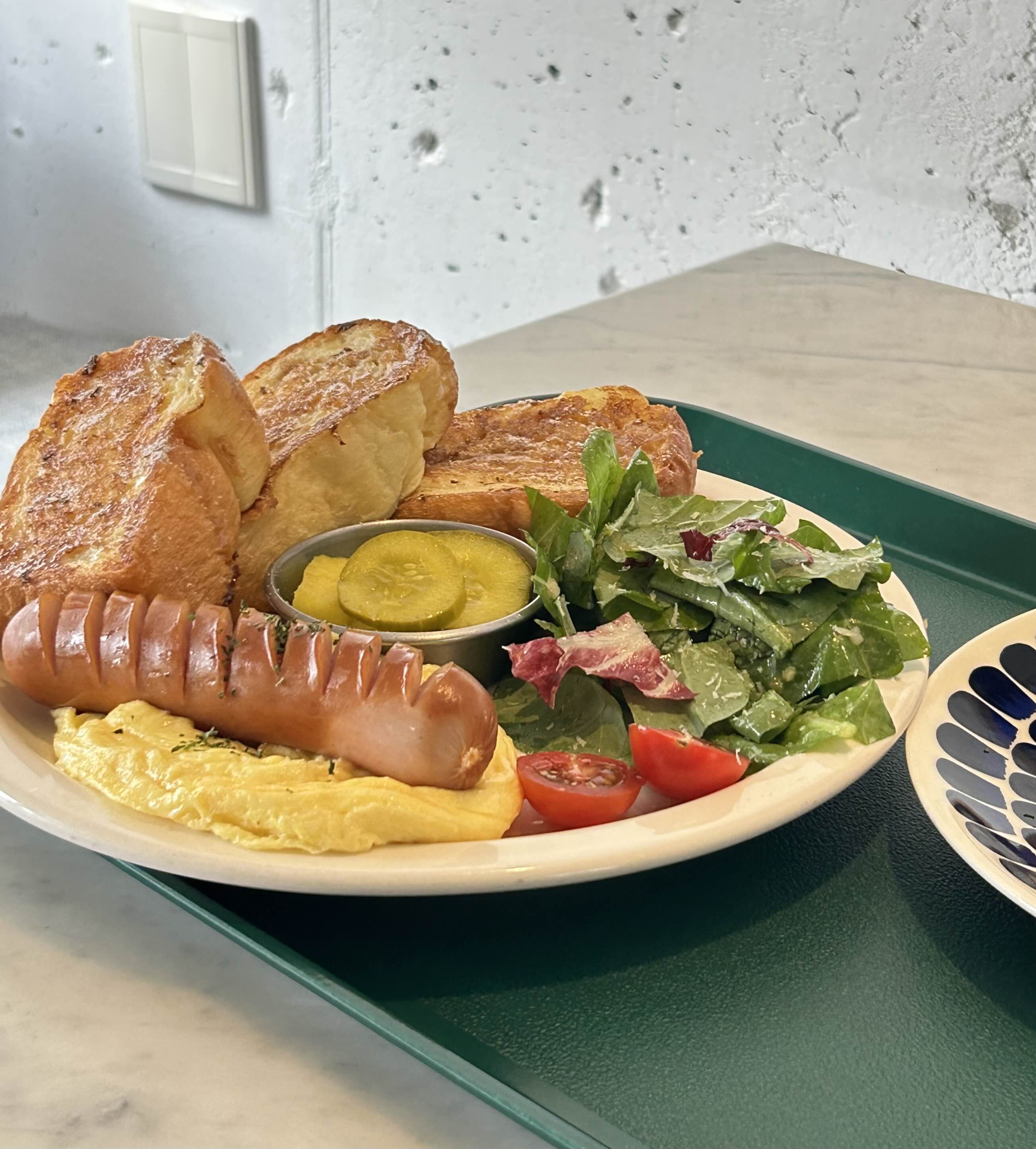 폭신한 프렌치 빵이 얼마나 먹고싶던지 집에서 하면 이맛이 안나서 꼭 땡길때마다 옵니다. 사이드로 치즈가루가 올려진 샐러드와 토마토 그리고 스크램블이 조화를 이루구요. 수제 피클 또한 맛있어서 그냥 먹어도 자극적이지 않아 참 좋습니다.