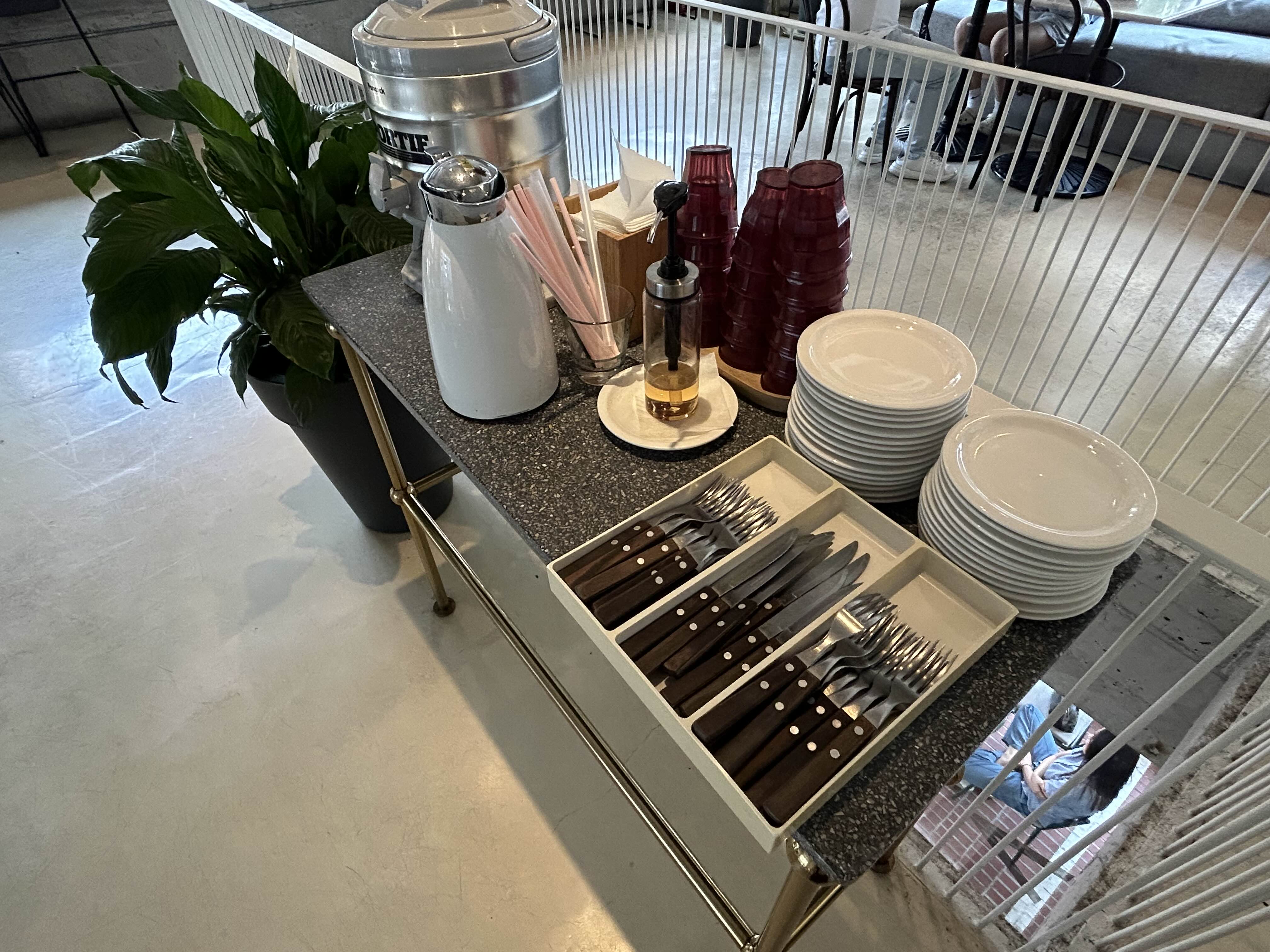 주문한 메뉴를 먹기위해 도구를 가지러 가보았어요. 포크, 칼, 스트로우, 앞접시, 물 등이 비치되어있어 셀프로 원하는 만큼 그때그때 가져다 쓰기 좋습니다.