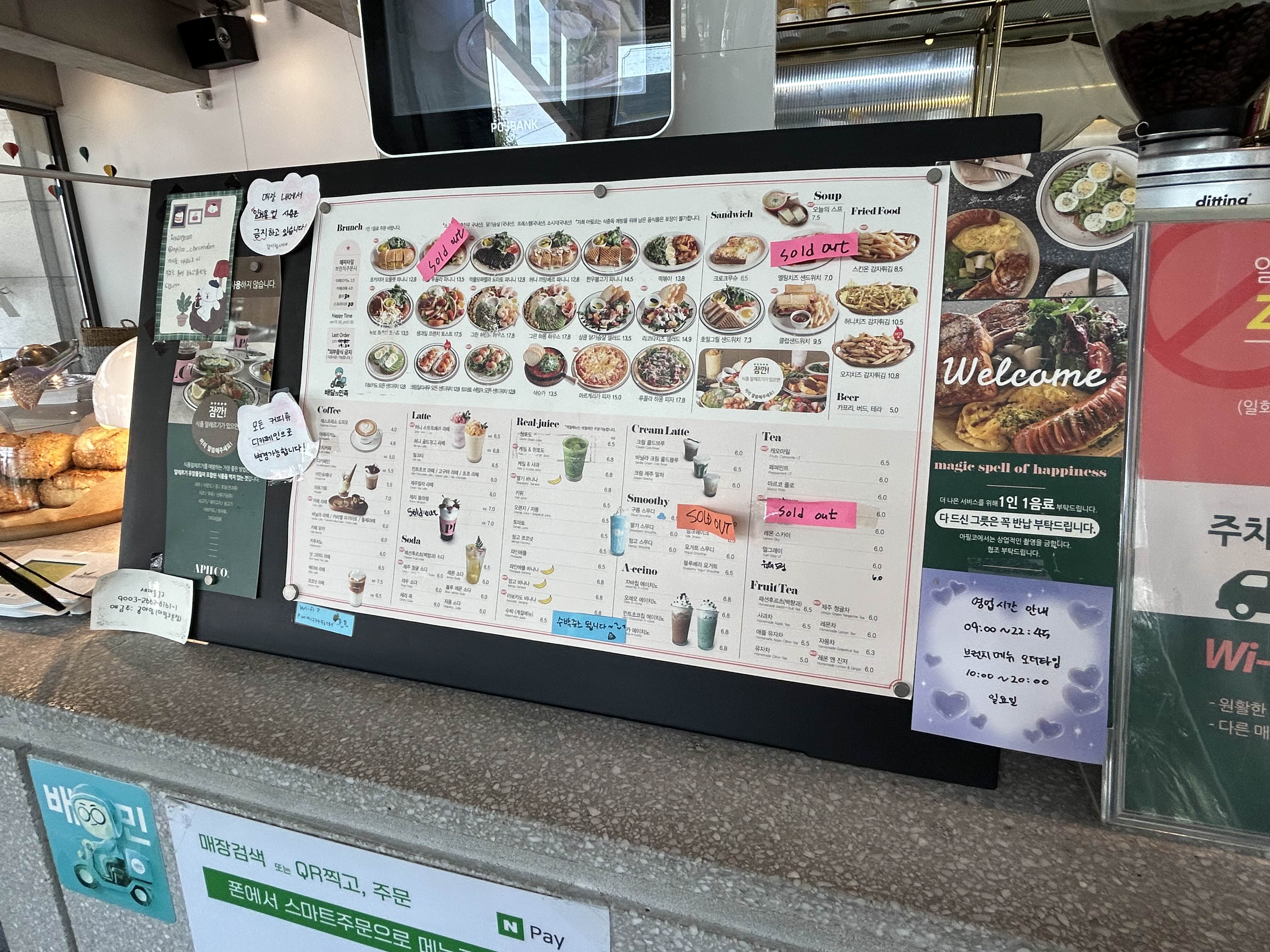 주변을 두리번 거리다 구경을 끝내고 메뉴를 선택합니다. 아필코에 오면 늘 먹는 고정 메뉴가 있는데 몇가지를 선택하고 음료도 초이스 한 후 선결제 합니다. 그리고 요즘 배민도 되고있어서 집에서 주문하기 완전 좋겠더라구요.