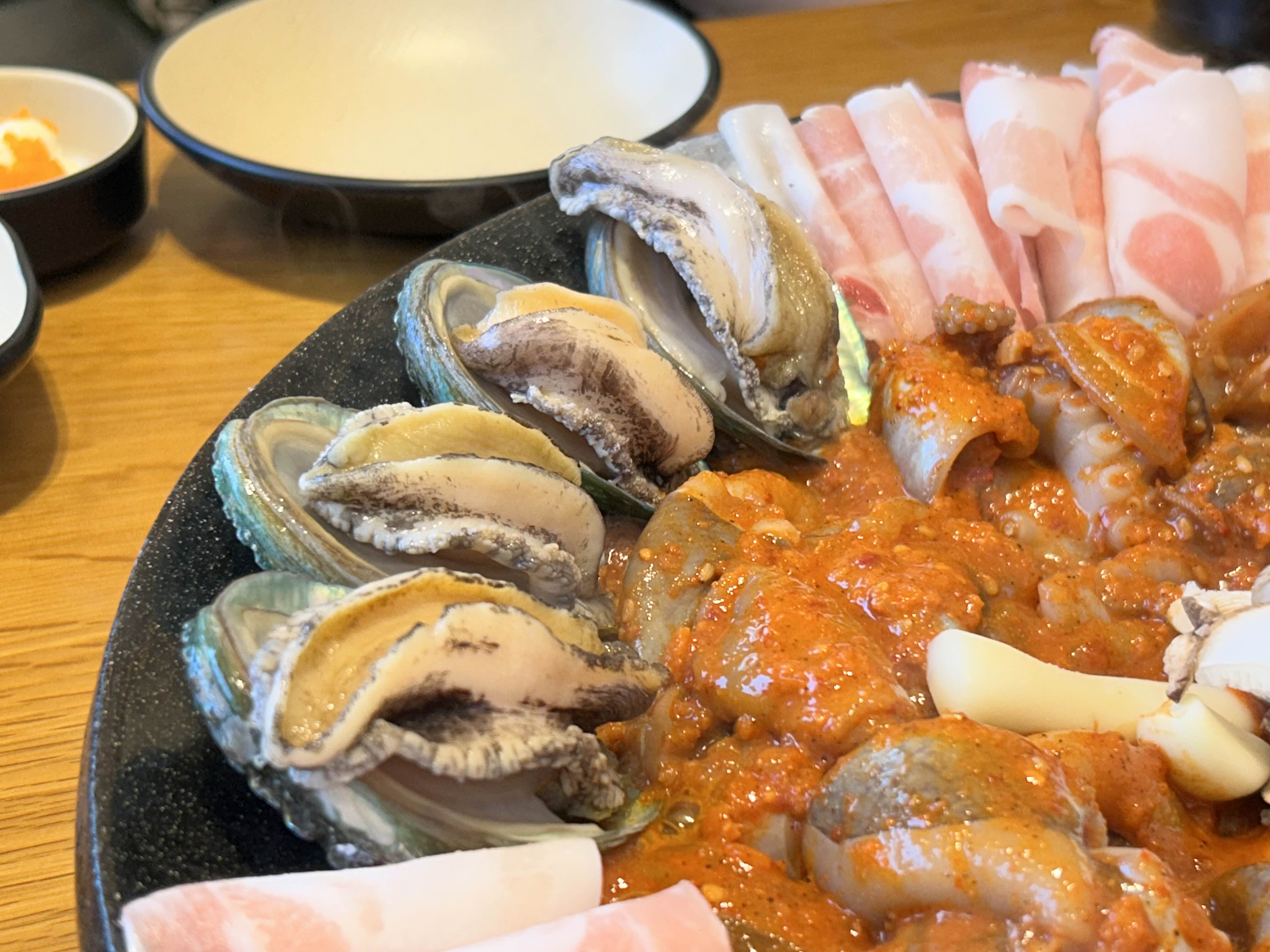 어느정도 달궈지면 직원분께서 열심히 섞어서 조리를 다 해주십니다. 전복도 껍질을 분리해서 먹기좋게 손질을 해주시고 어느정도 익으면 먹어도 된다고 친절히 말씀해 주셔요.
