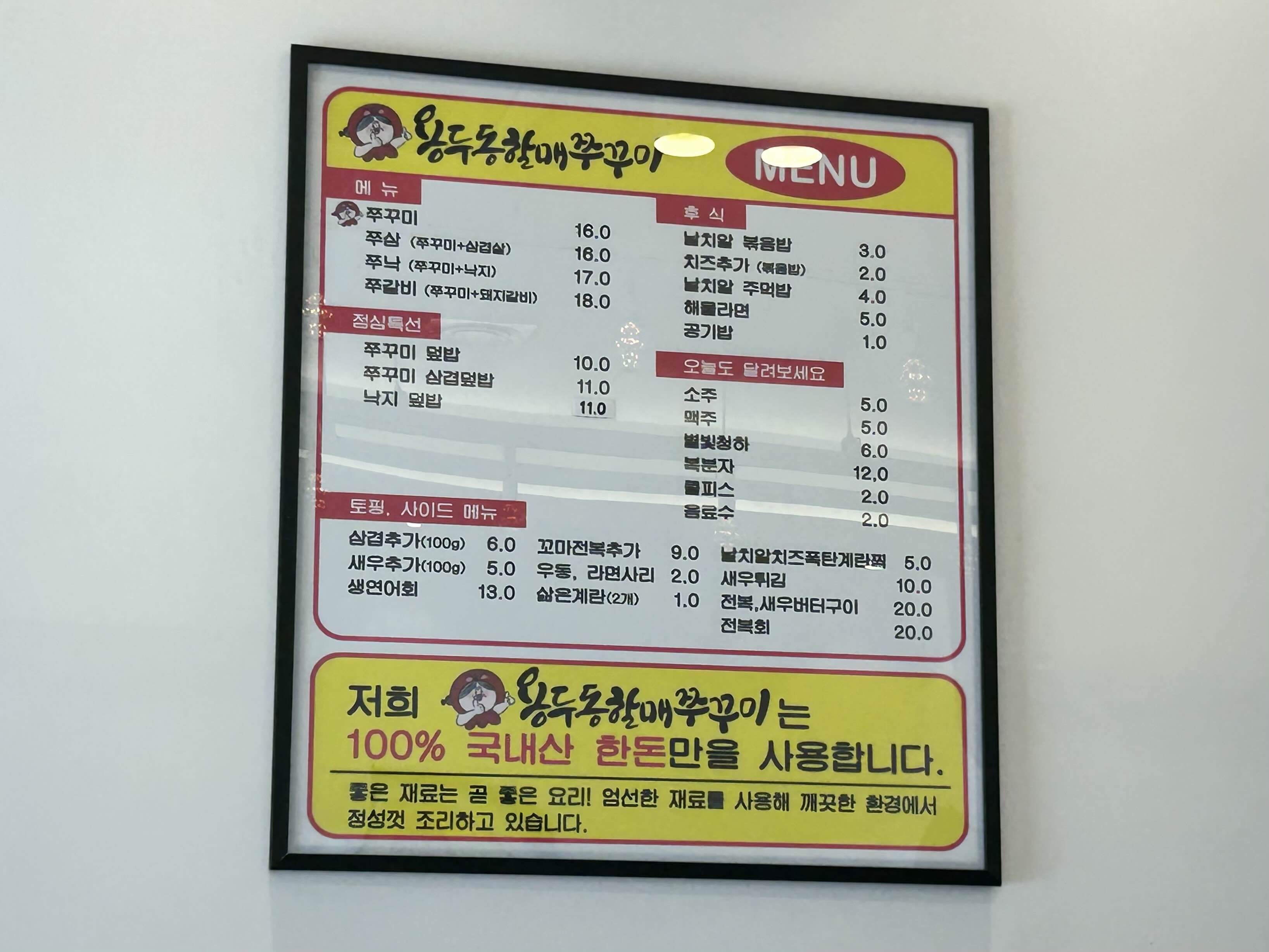 용두동 할매쭈꾸미 다녀왔습니다. 양산동에 오픈한지 얼마안된 매장같아요. 처음 들어보는 프랜차이즈인데 맛있다는 지인말 듣고 오게되었네요. 간판부터 강렬해서 지나가다가 바로보여서 찾기가 수월했습니다.