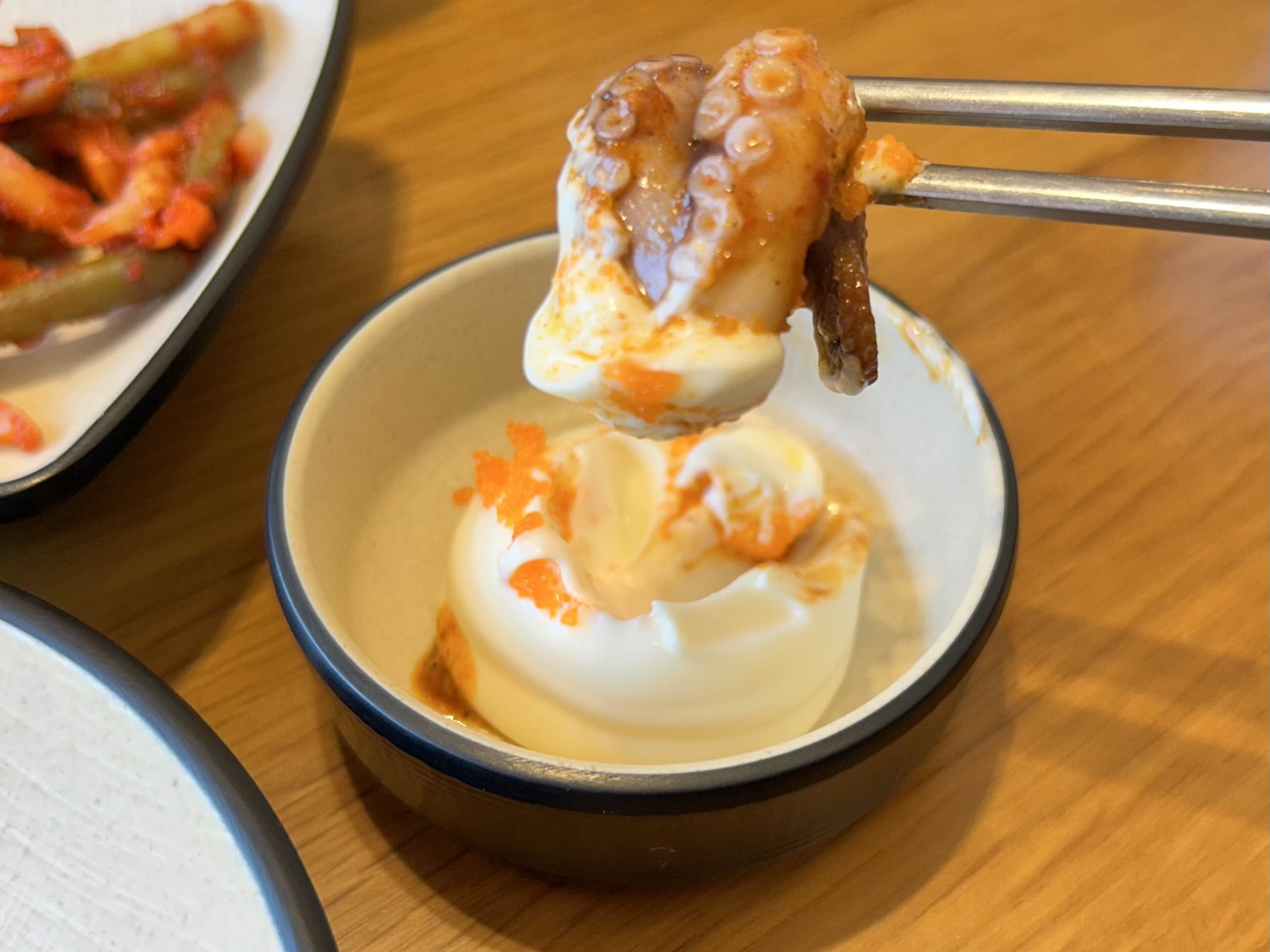 날치알이 올라간 마요소스를 하나씩 주시는데 통통하게 살이 오른 쭈꾸미를 집어서 콕 찍어먹으니 너무 맛있는거에요. 적당히 매콤하고 달달하면서 고소한 마요네즈가 부드럽게 감싸는 소스맛이 입에 착착 감깁니다.