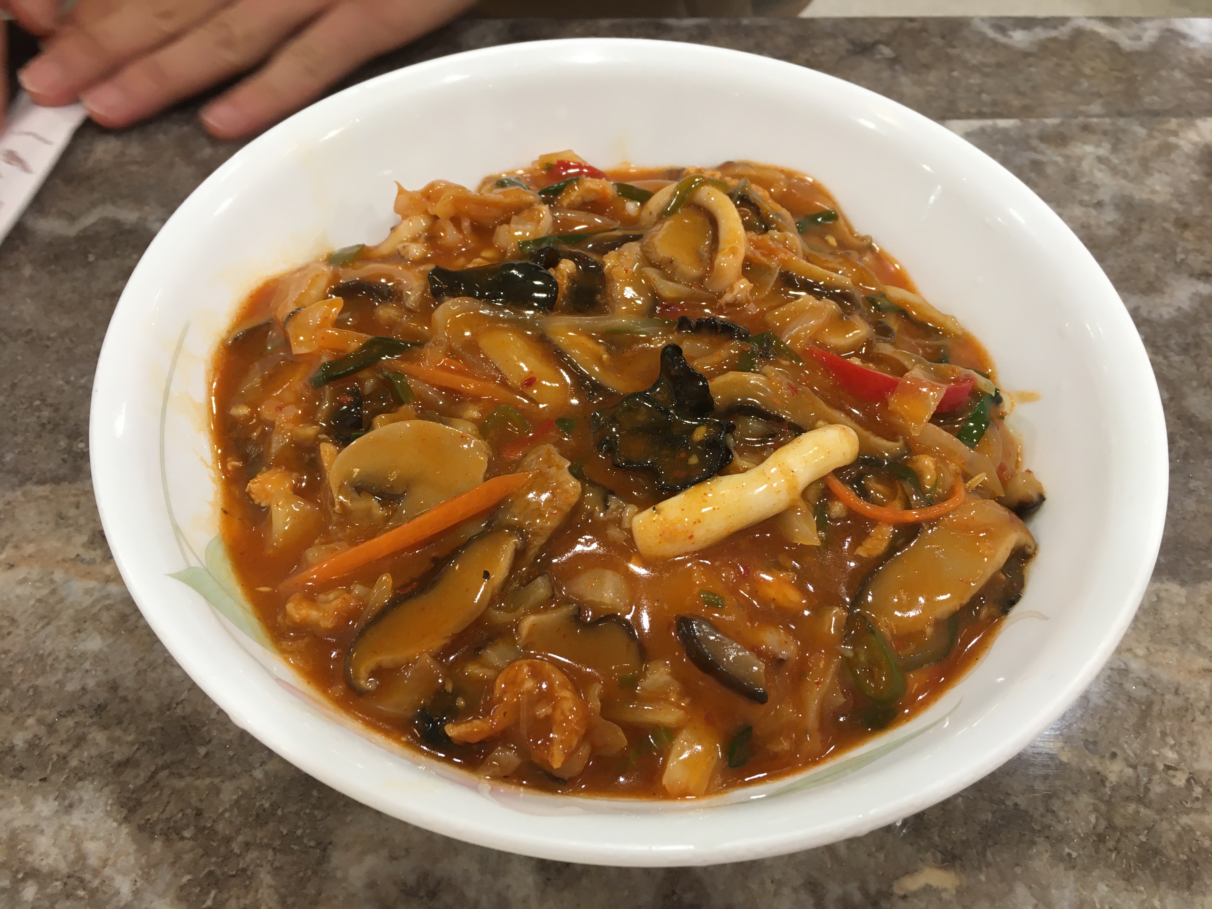 일행이 주문한 건짬뽕 입니다. 국물이 아닌 전분을 넉넉히 사용하여 각종 해산물과 야채가 잘 어우러지게 만들어 면위에 올려 내어진 모습입니다. 해산물이 참 많아서 먹음직 스럽더라구요.