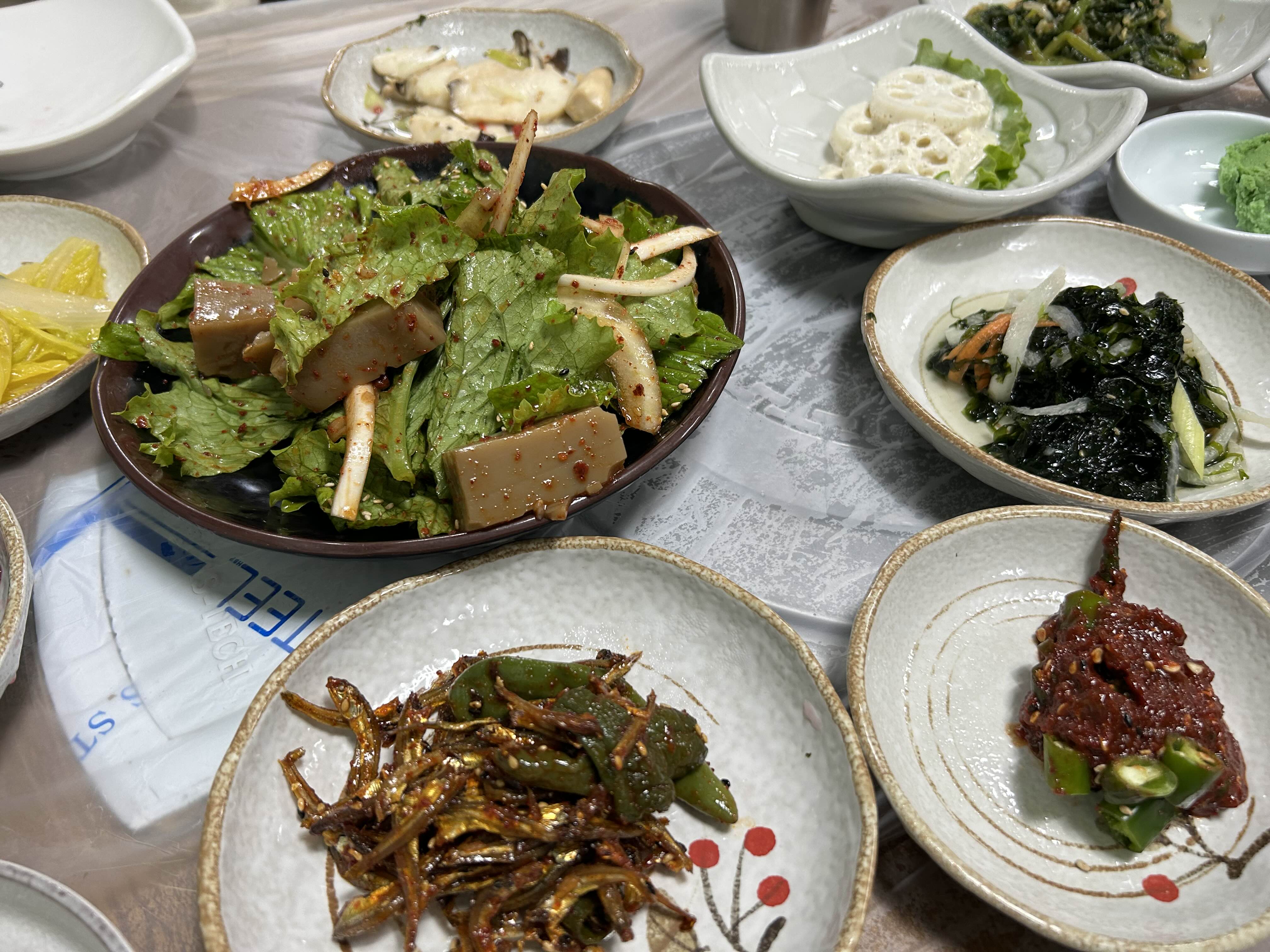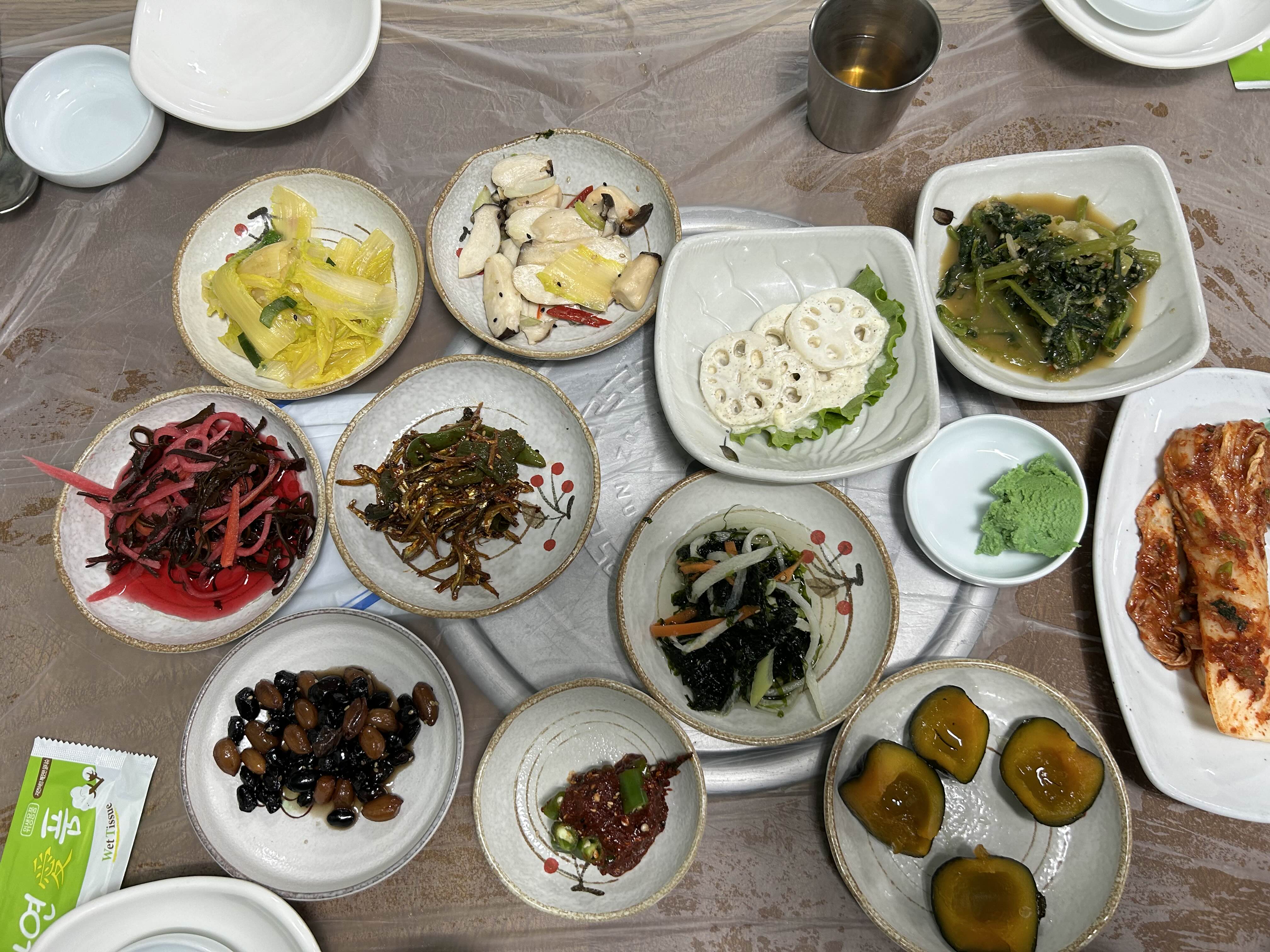 착석을 하니 밑반찬들을 셋팅해 주십니다. 반찬이 맛있다고 하시더니 정말 하나하나 다 맛이 좋더라구요. 특히 맨 위에있는 물김치와 김장김치가 정말 맛이 좋았습니다.