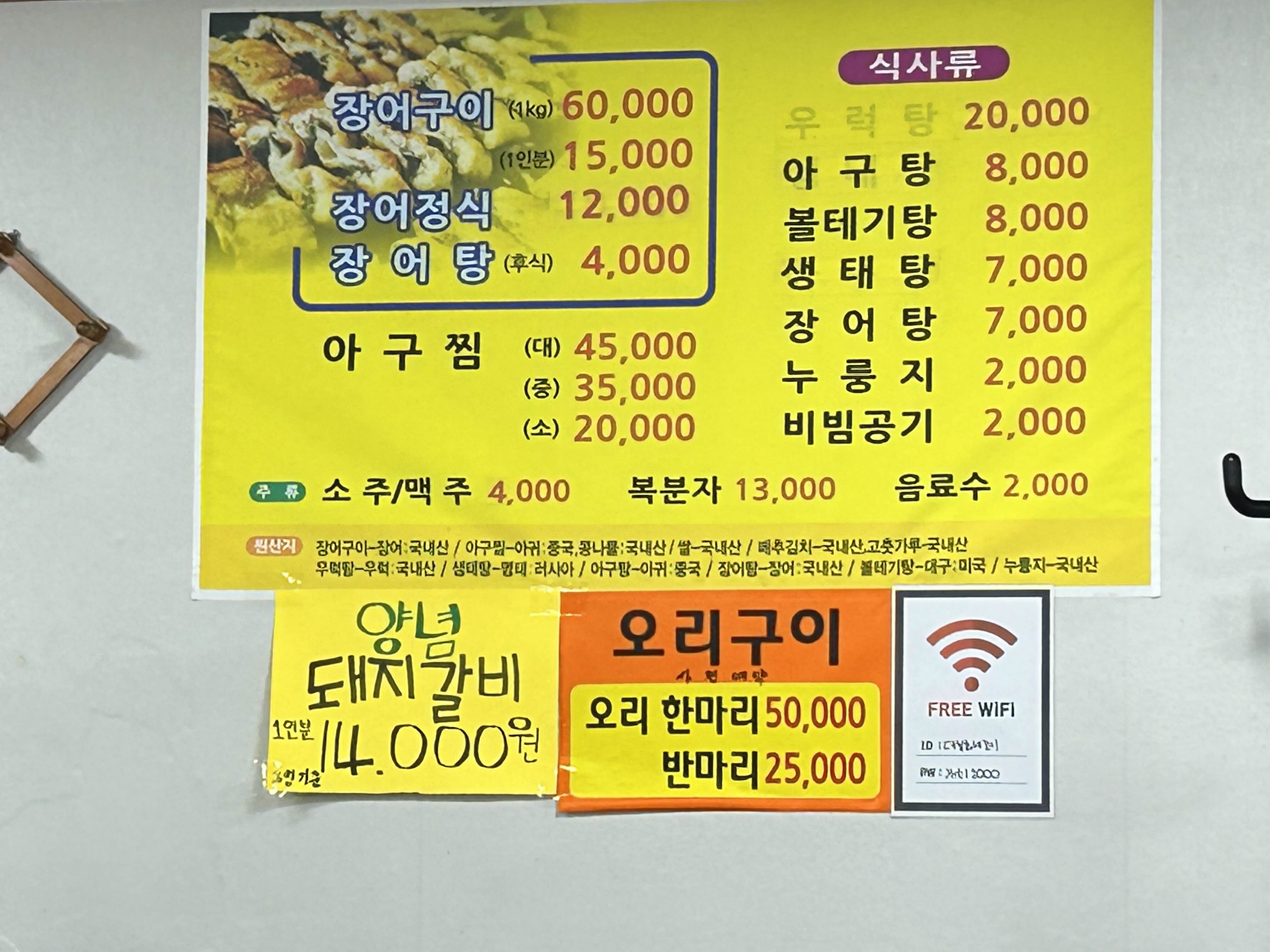메뉴판을 보니 생선 위주이고 오리와 돼지갈비도 판매하고 있습니다. 다른 테이블을 보니 거의 아구찜을 드시고 계시더라구요. 같이간 일행은 가족들 주신다며 포장도 미리 말씀하시고 주문하셨습니다.