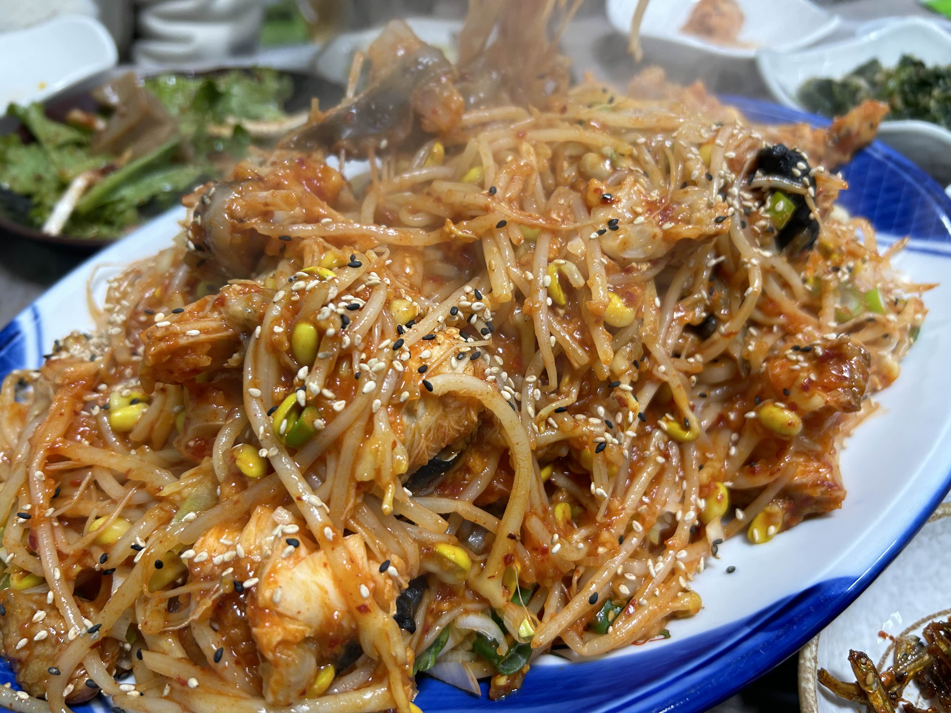 드디어 아구찜이 나왔습니다. 사진상으로는 작게 보이는데 큰 접시에 엄청난 양이더라구요. 콩나물 밑에 아구들이 깔려있습니다. 완전 푸짐해서 다 먹을수 있으려나 할정도로 어마무시한 양이에요.
