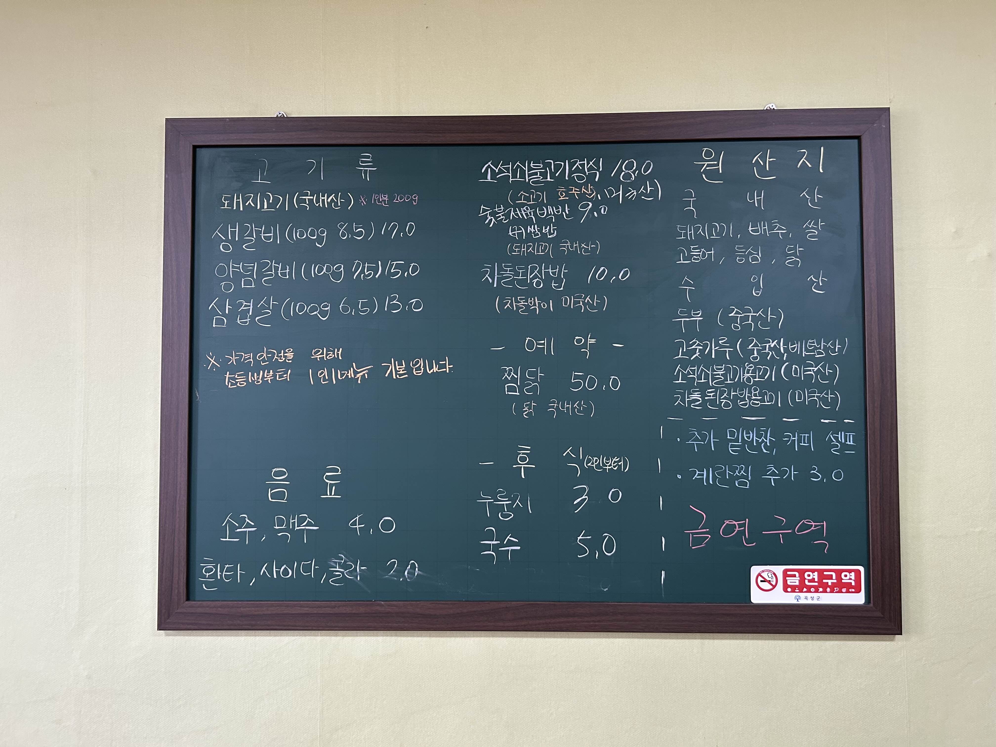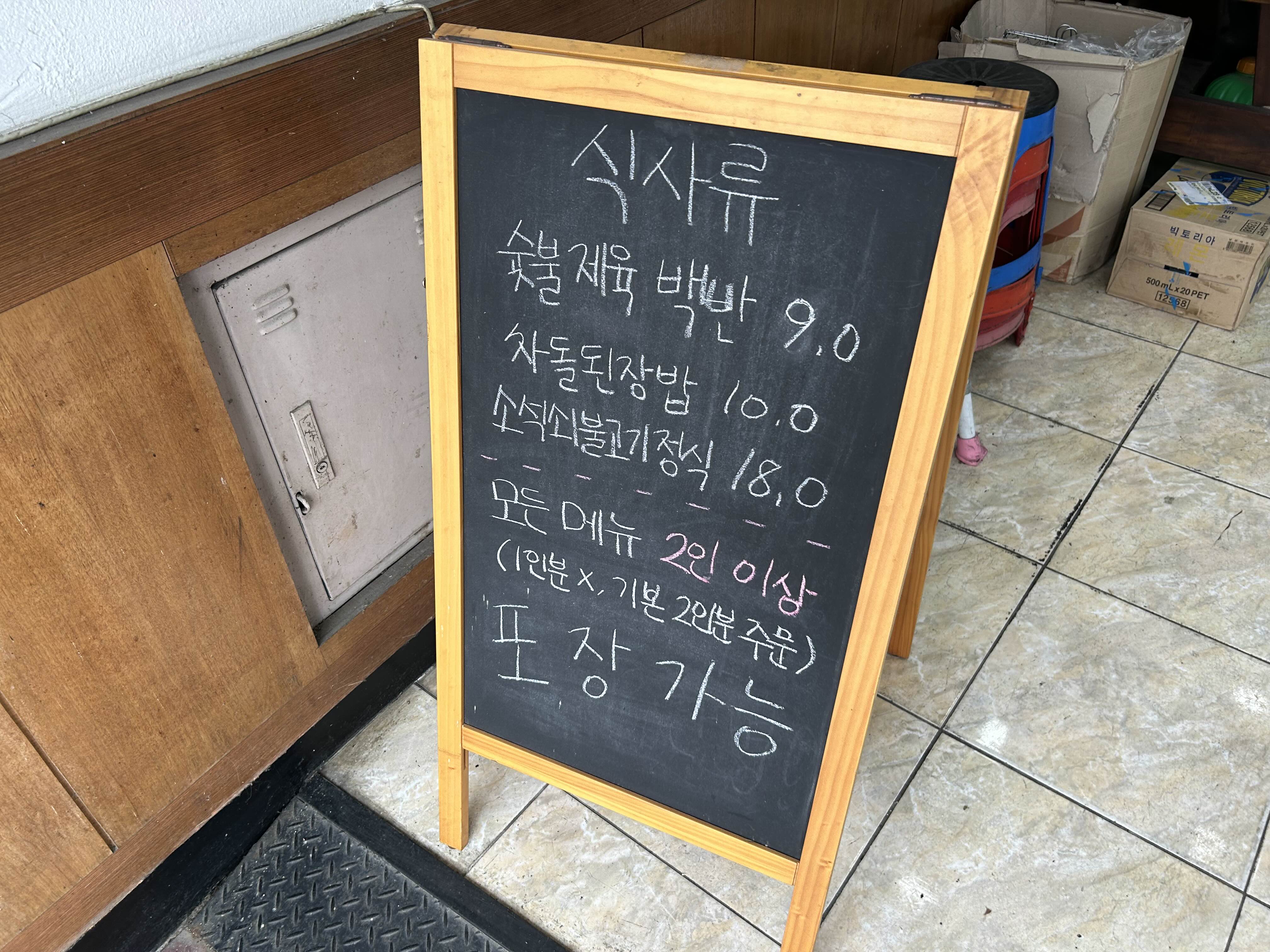 매장입구에 대표메뉴가 적혀있습니다. 저희는 맨 윗쪽에있는 숯불제육 백반으로 먹기로 결정했습니다. 대표메뉴 가격만 봐도 도전해볼만 하다 라는 생각이 들더라구요.