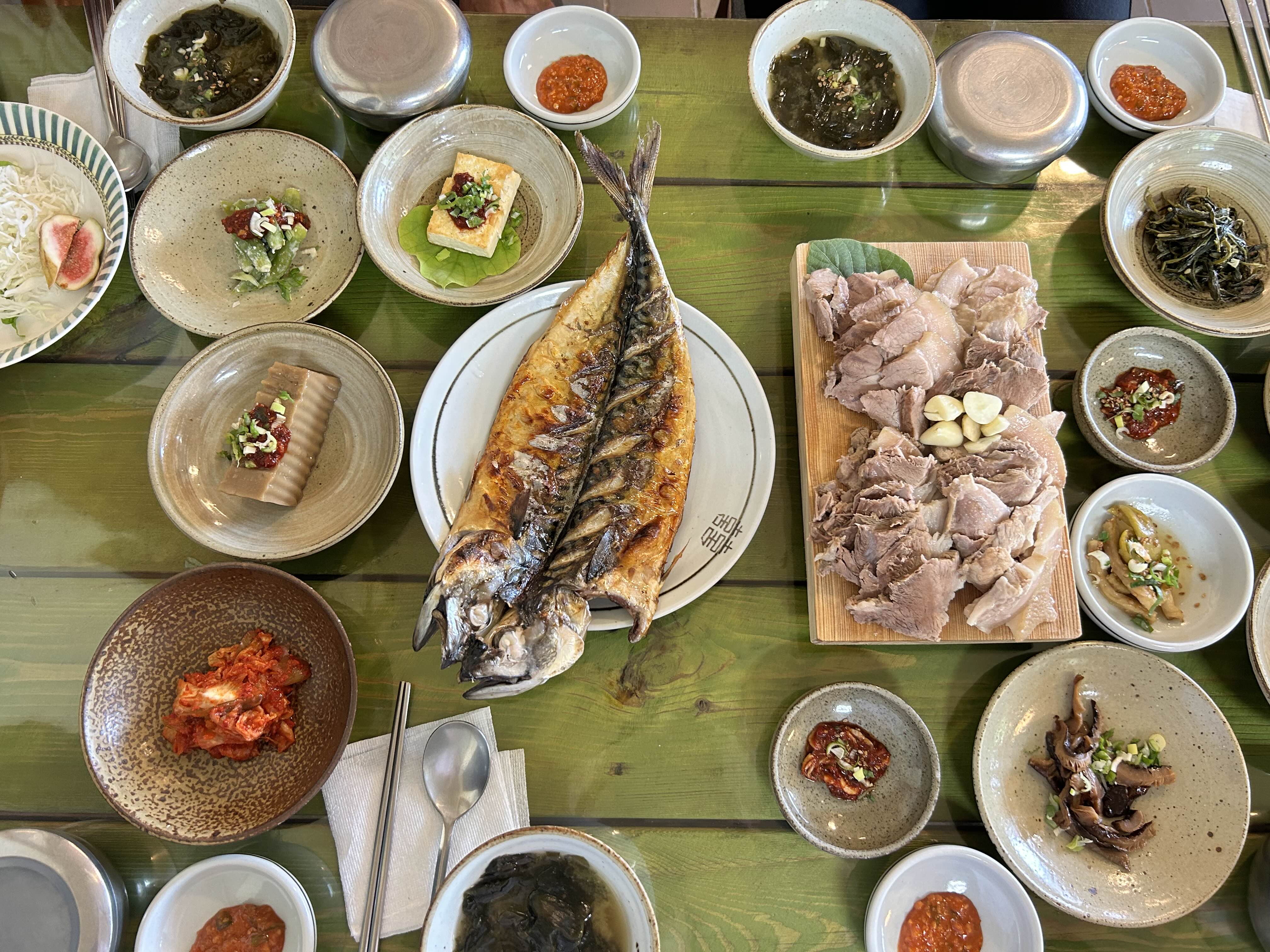 반찬 한가운데 공간을 만들어 메인메뉴인 고등어구이와 보쌈을 내어주셨습니다. 이곳은 메뉴가 딱 하나입니다. 이렇게 해서 보쌈정식 4인이 모두다 나왔네요. 제주 물가를 생각한다면 1인 17,000원이 꽤 괜찮은 한상인것 같다는 생각이 듭니다.