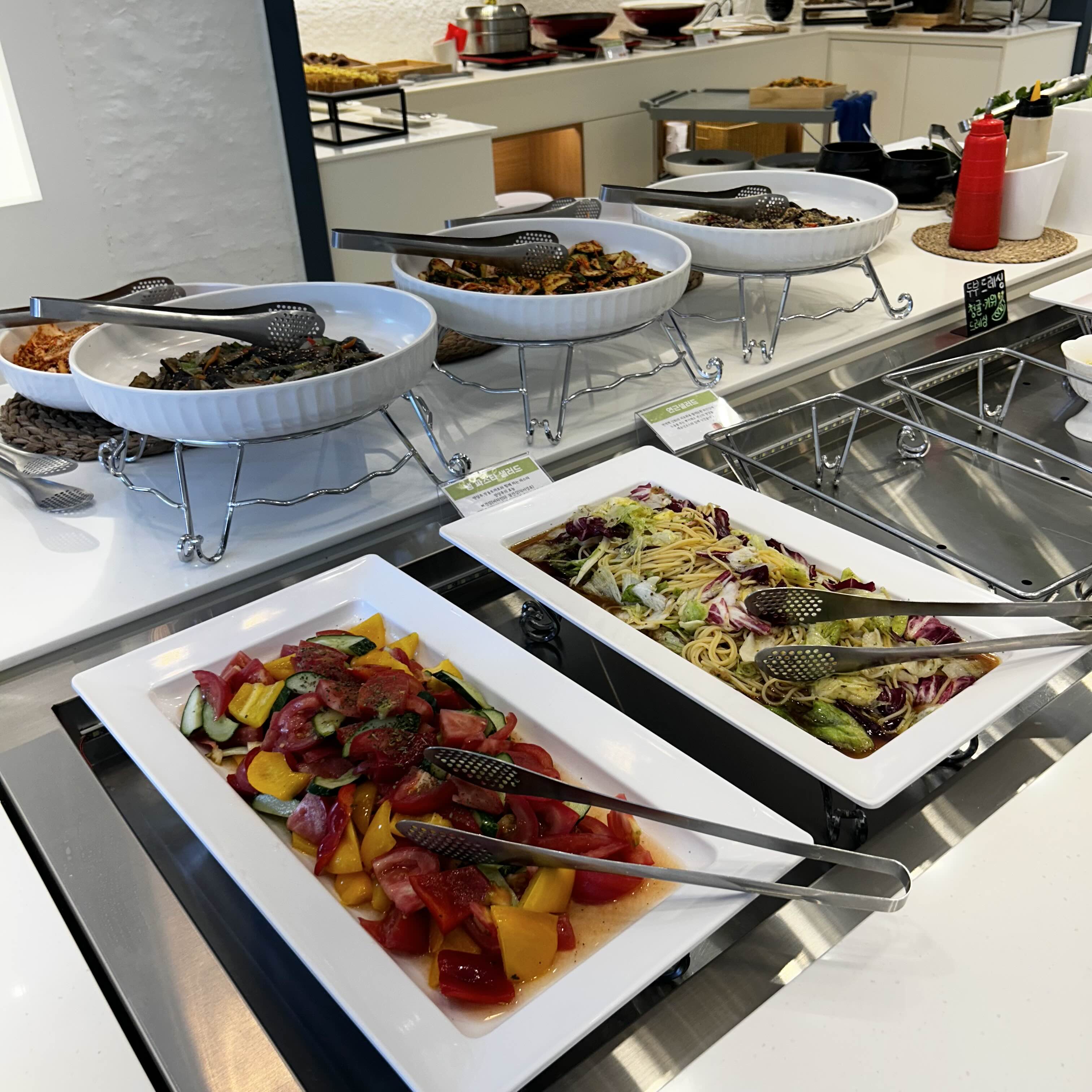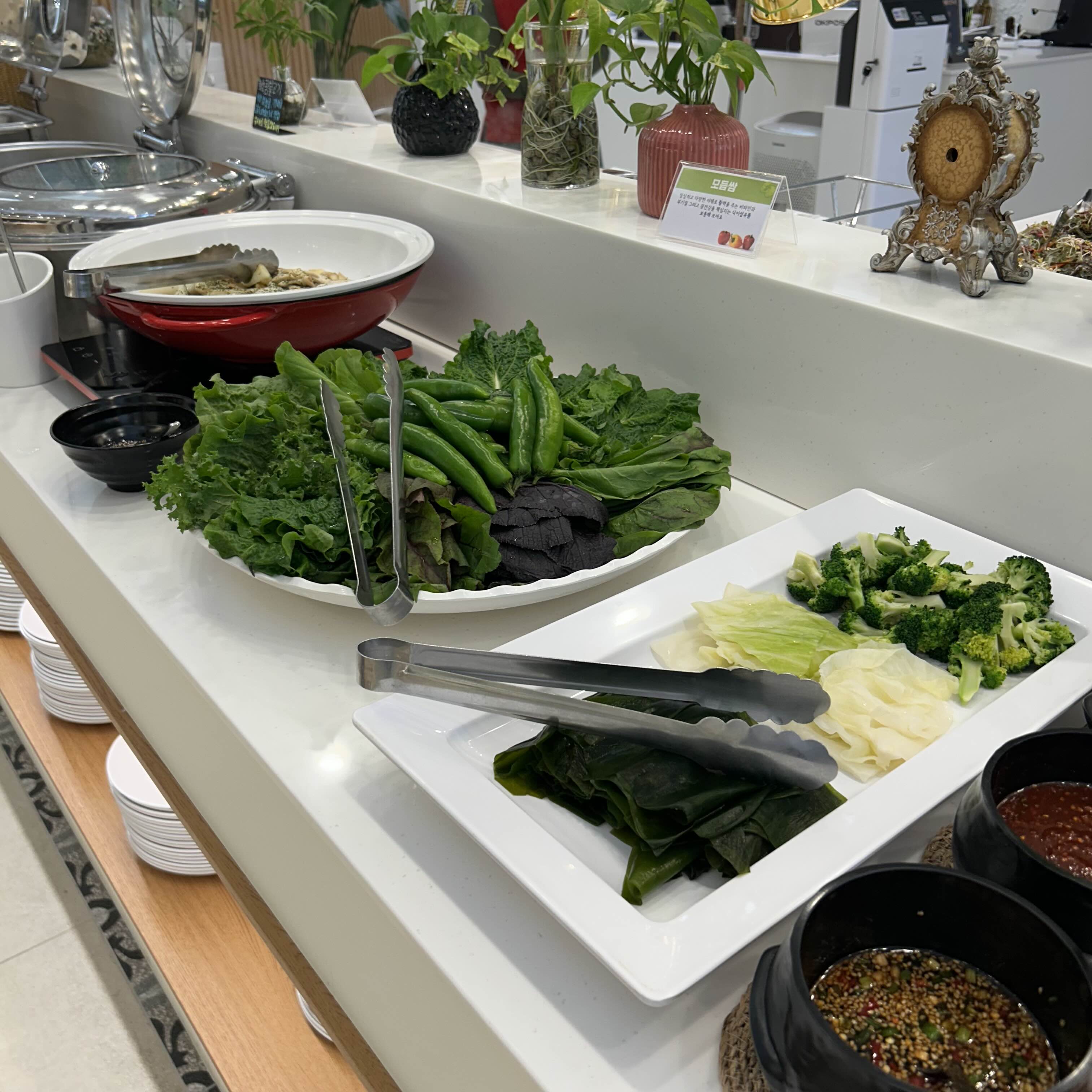 다른 코너에는 이렇게 모듬쌈이 준비되어있는데요. 소복히 쌓인 쌈채소와 익힌 브로콜리, 양배추, 미역쌈이 있었습니다. 간장이나 고추장 소스중에 취향껏 담아가면 되더라구요.