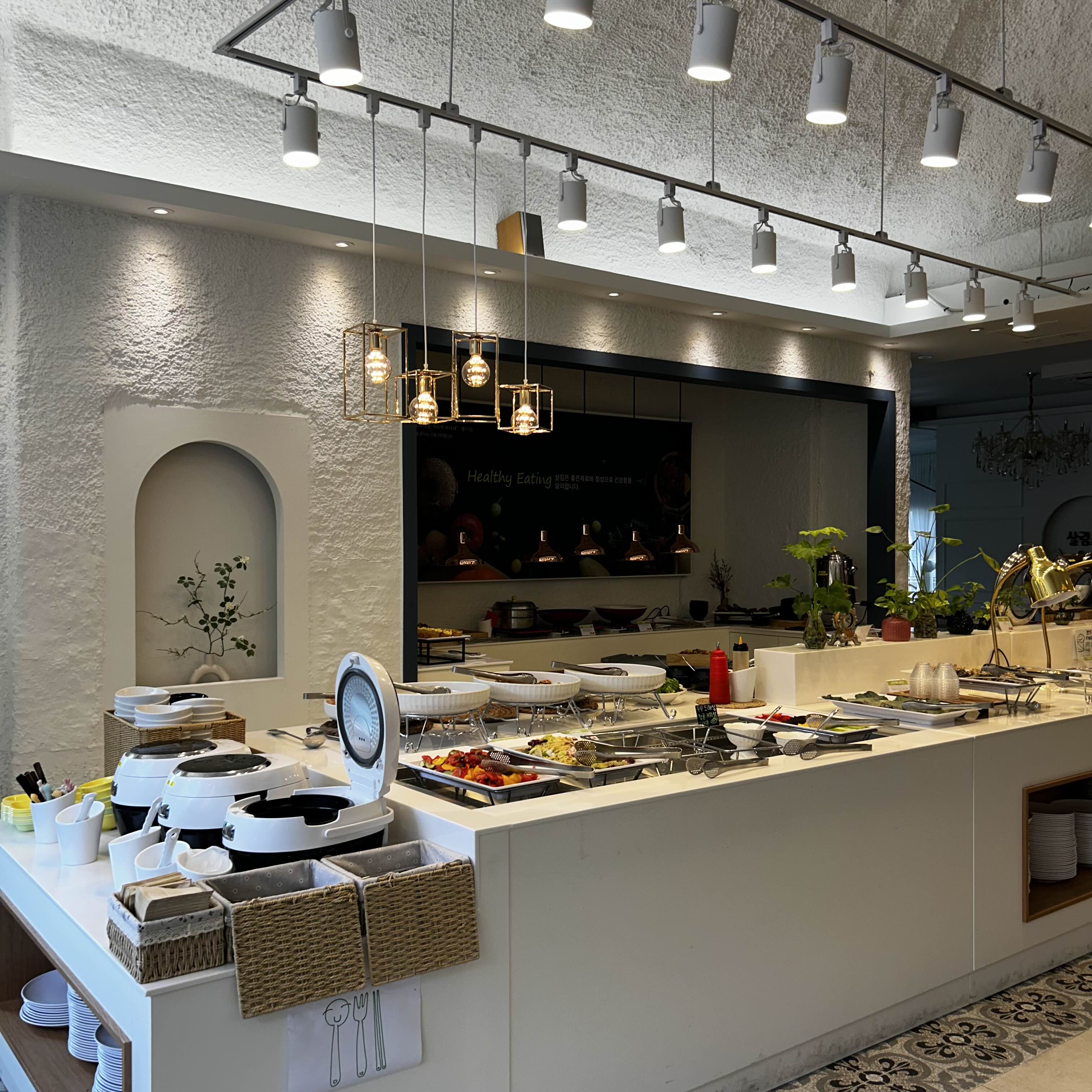 결제를 마치고 주변 곳곳을 둘러보는데 매장자체가 깔끔하고 은은하니 쾌적합니다. 곳곳에 큰 접시들과 찬기에 음식들이 가득 올려져 있구요. 밥솥 3개에 백미, 현미 등 건강 상태에 맞게 골라먹을 수 있어 좋겠더라구요.