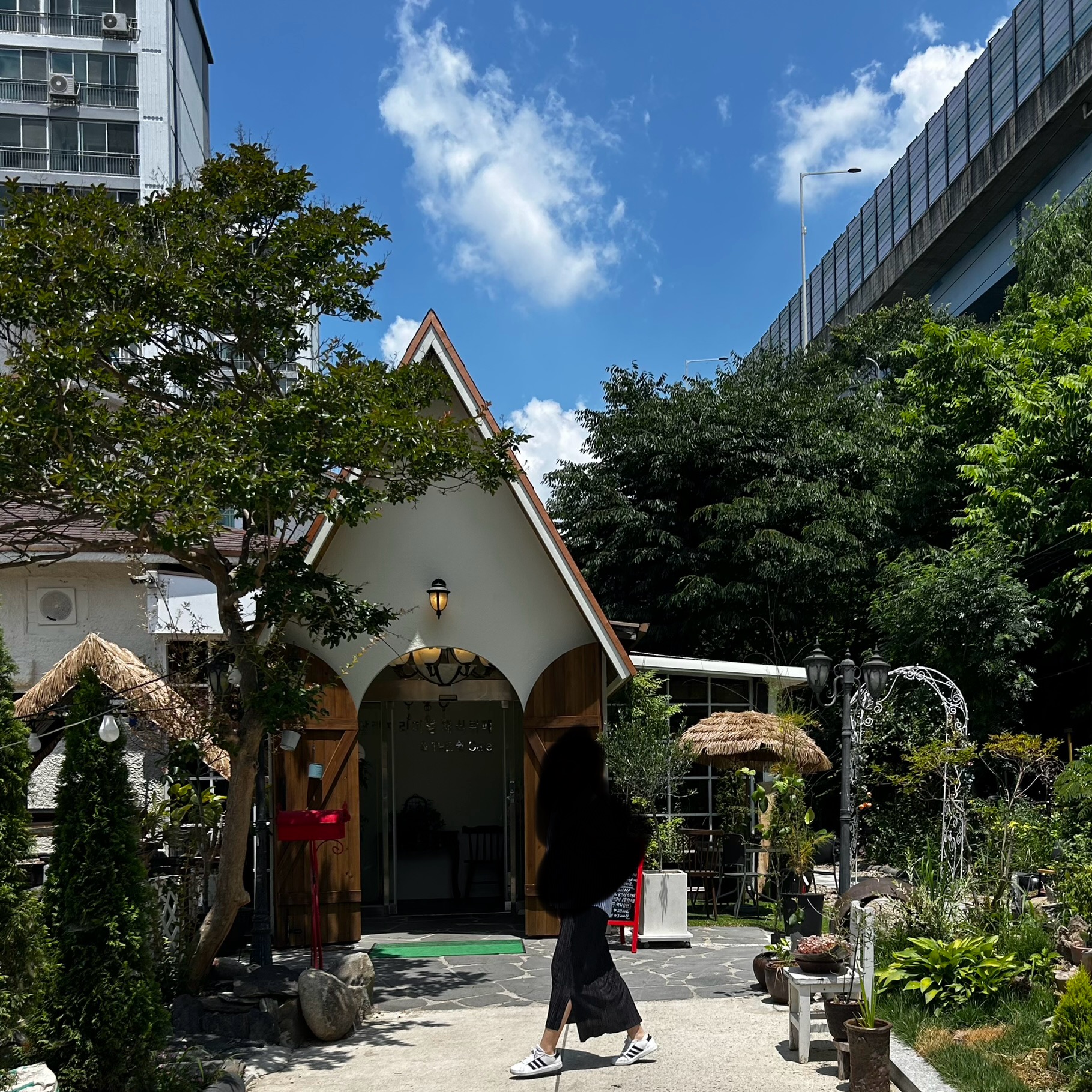 그리고 마무리는 매장앞에서 전신샷을 찍어보았네요. 이날 하늘이 너무예뻐서 숲속에있는 집같이 예쁘더라구요. 주택과 아파트 단지 근처에 이런곳이 있다니 좀 자주 와봐야겠어요.