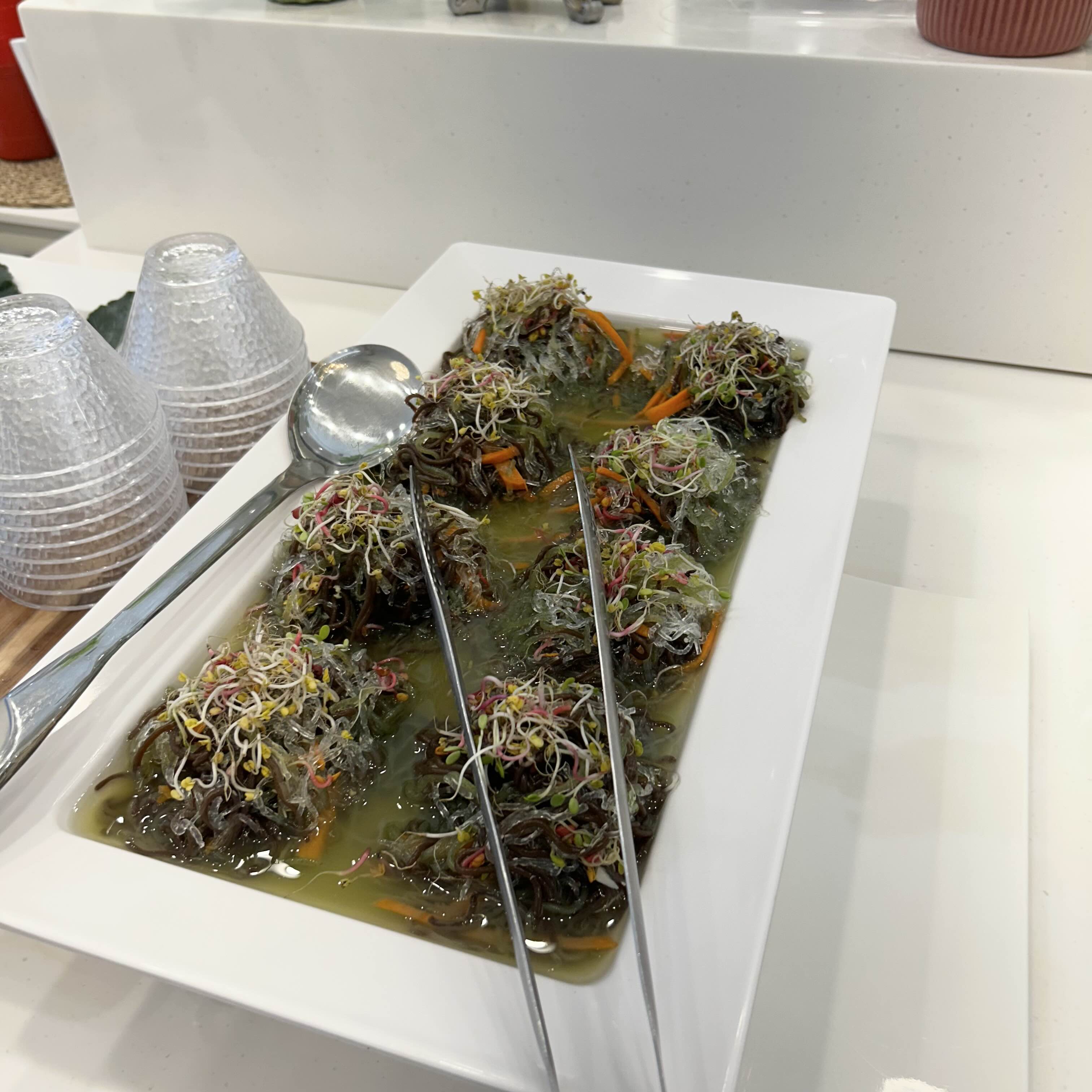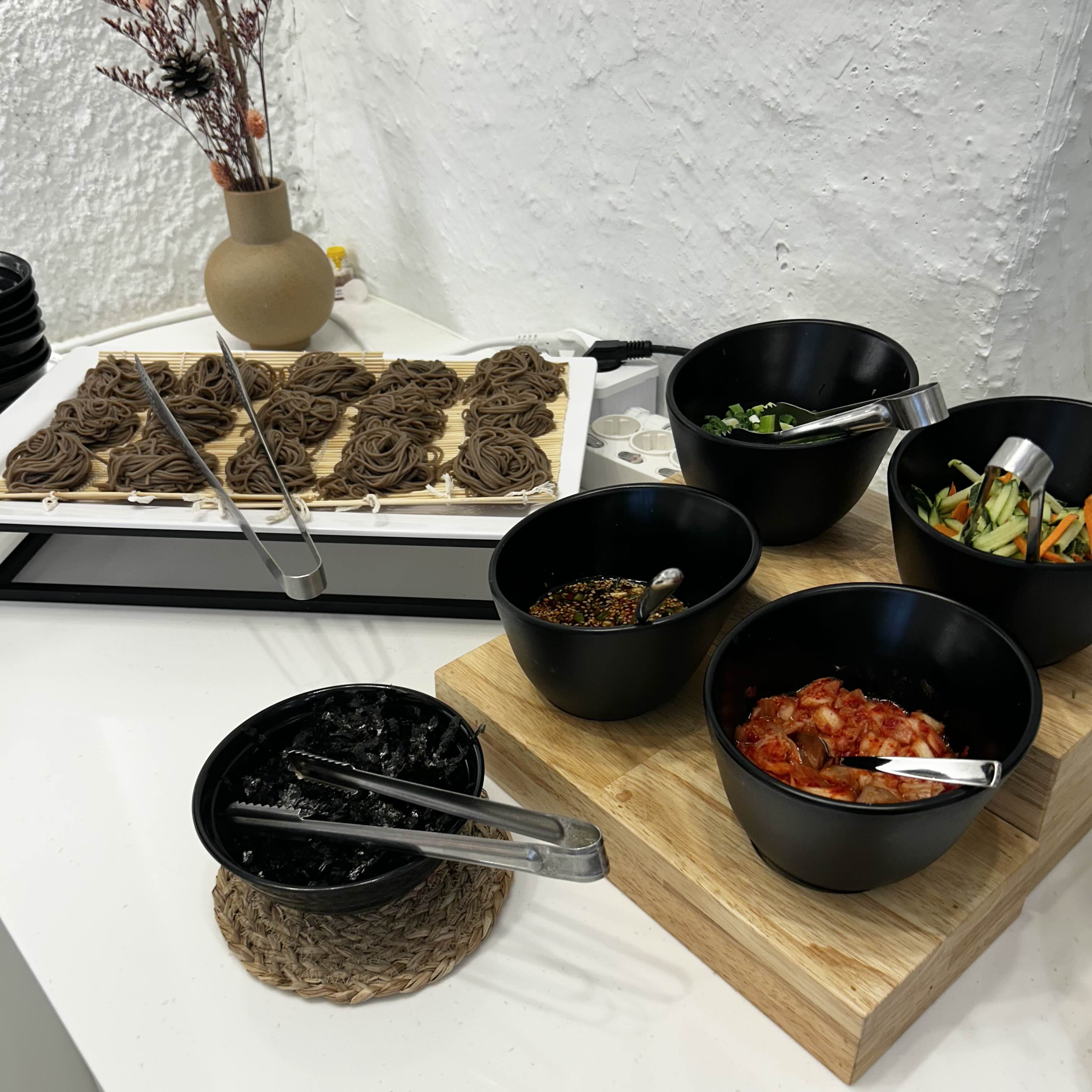 여기는 모밀면 코너인데 한입크기로 면을 말아놓았고 비치되어있는 고명들과 김가루들이 정성껏 준비되어있습니다.