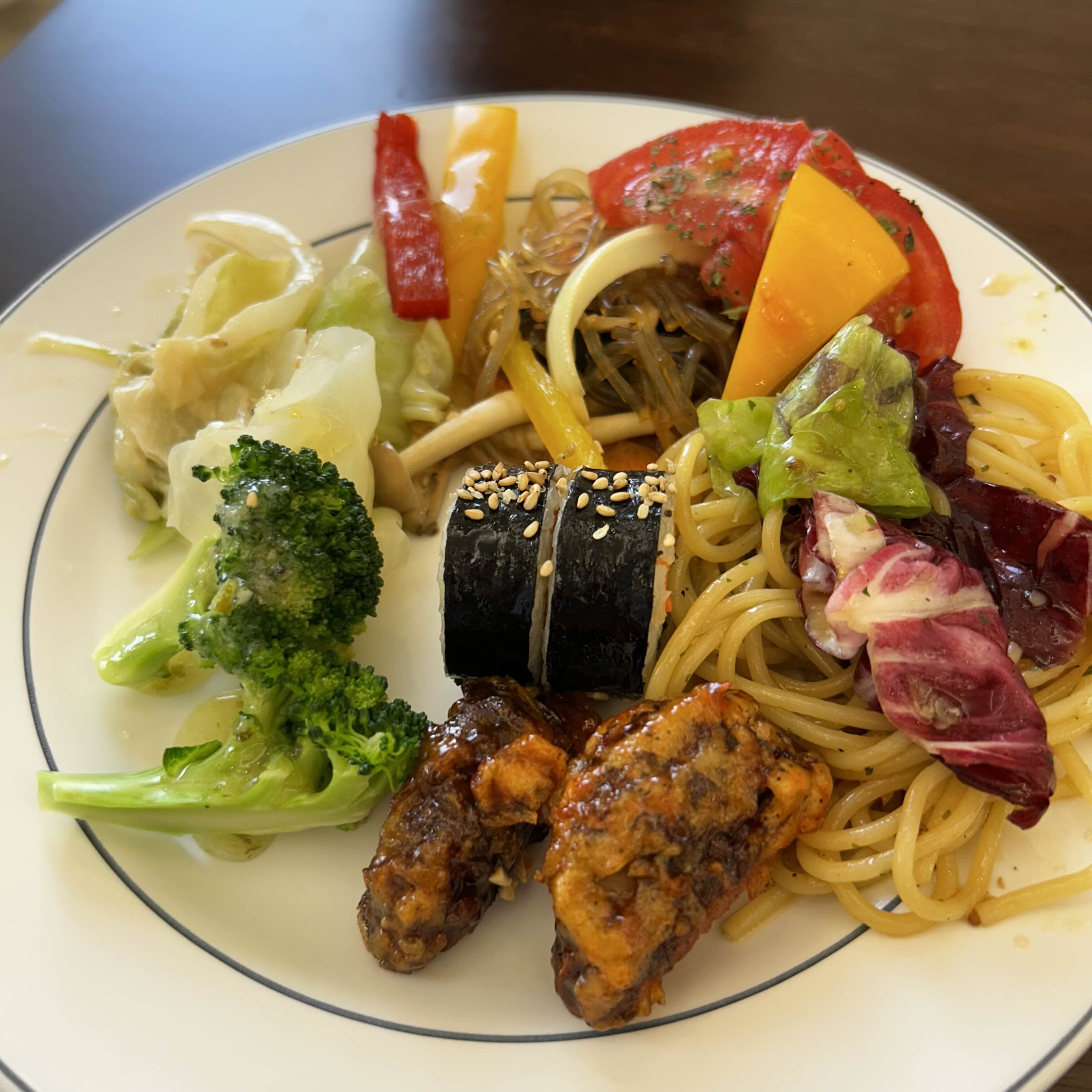 두번째 접시를 담아왔습니다. 가운데 저 김밥이 은근 맛있더라구요. 먹을게 다양해서 조금만 담아와서 아쉽지만 맛있게 먹었네요. 그리고 가지탕수는 매콤달콤 나름 적당히 자극적인 맛이라 입에 착착 감깁니다.