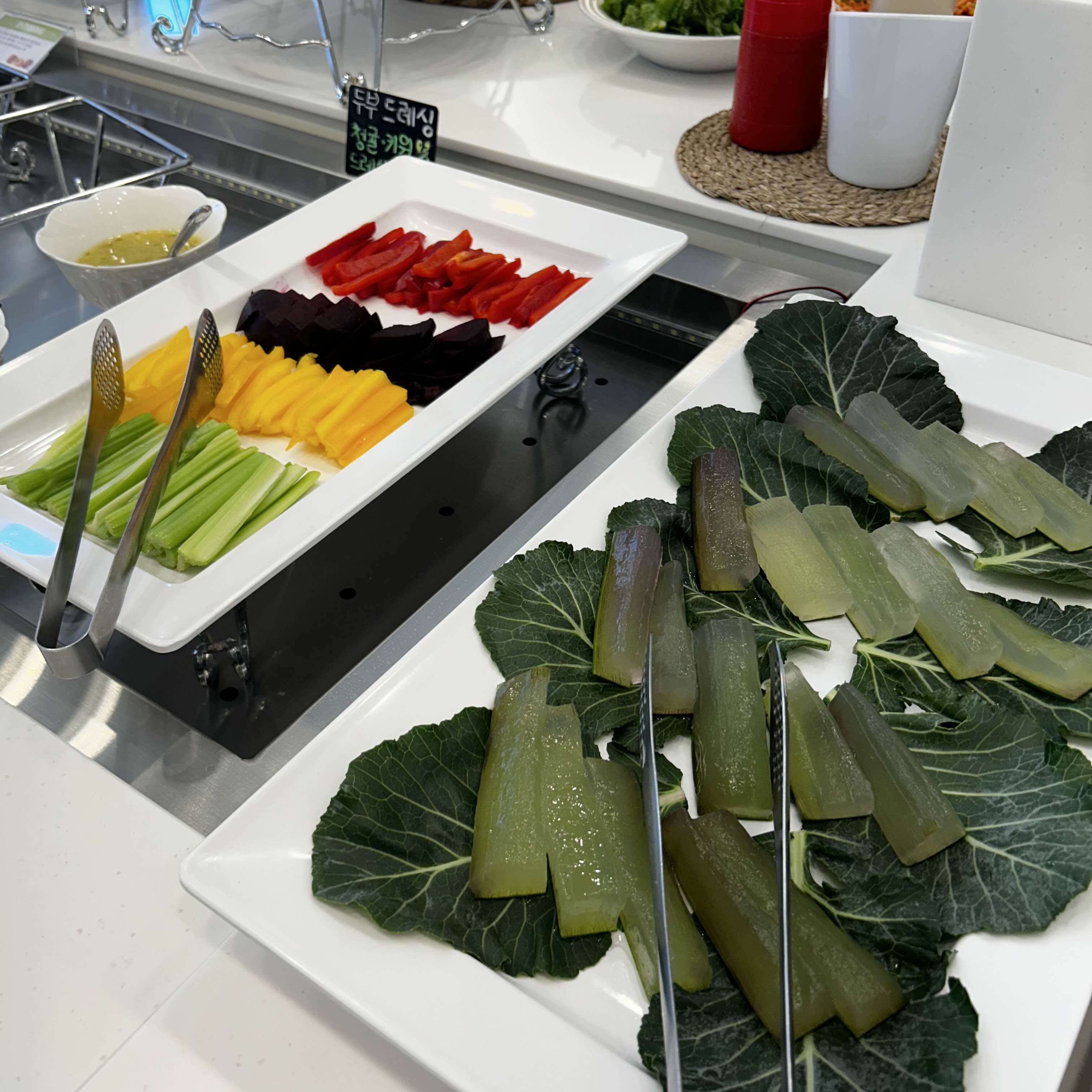 생으로 먹는 야채들도 한입에 먹기좋게 썰려있고 오른쪽에는 알로에도 있더라구요. 이렇게 다양한 야채들이 구비된건 처음봅니다.