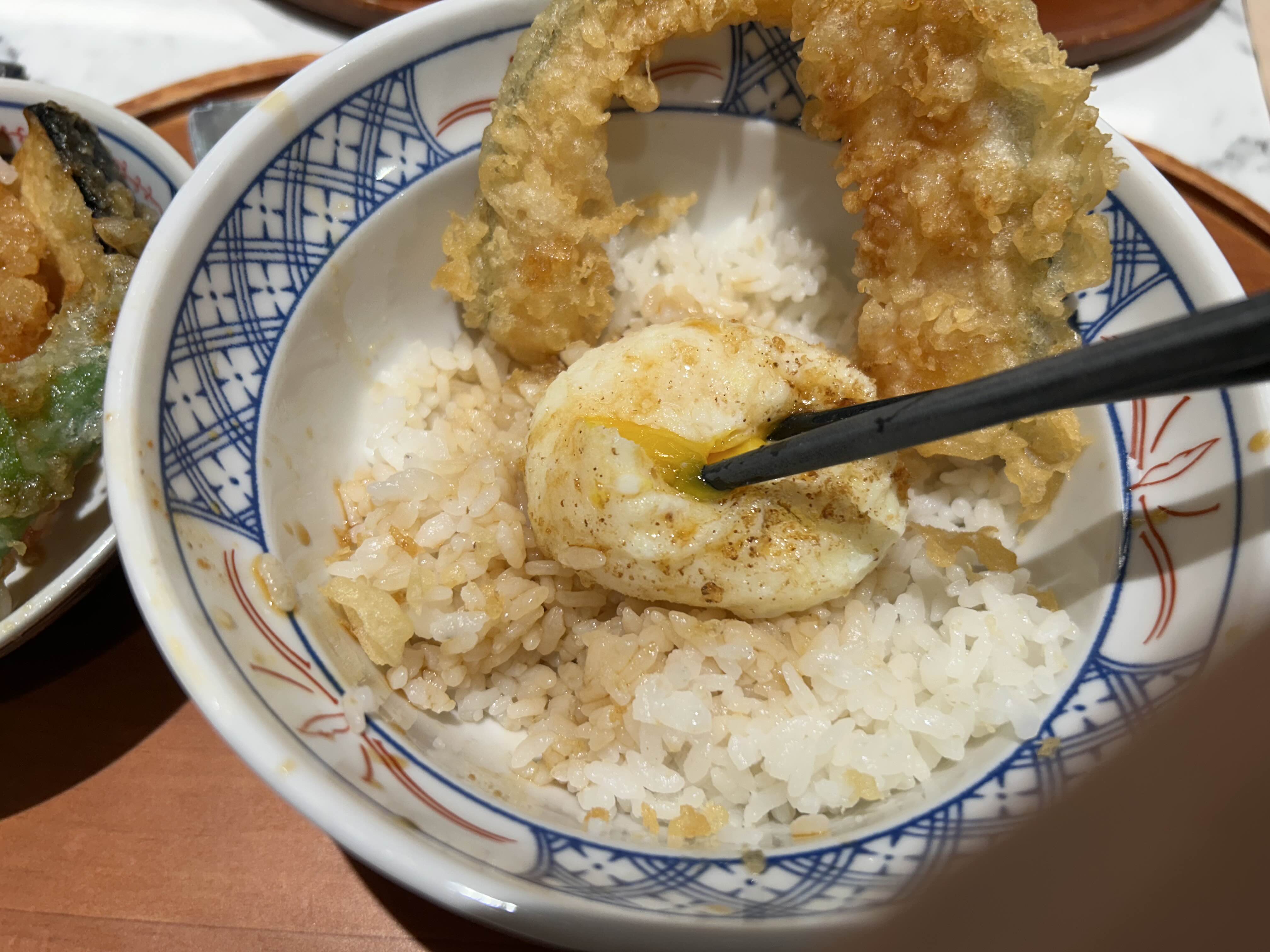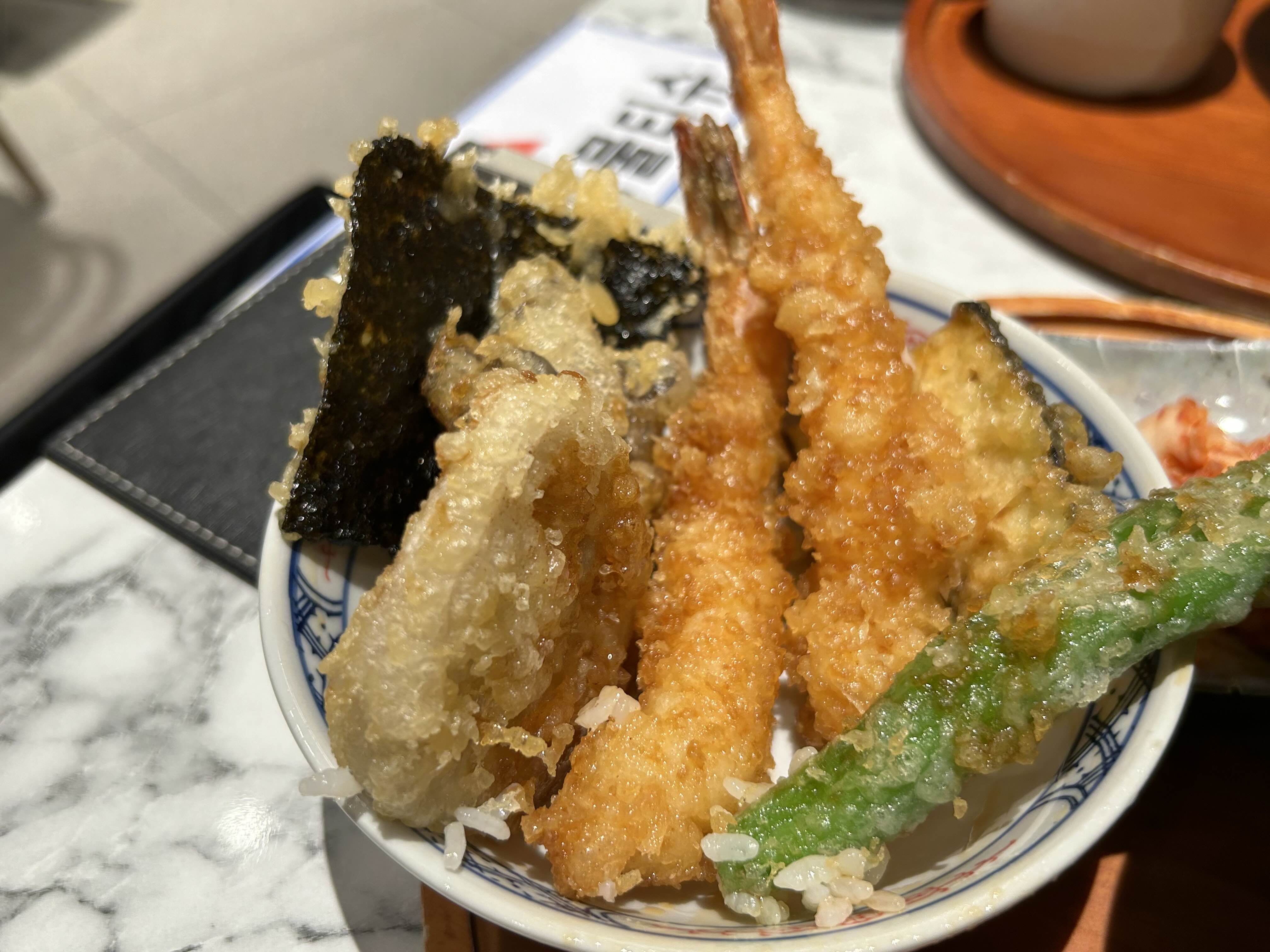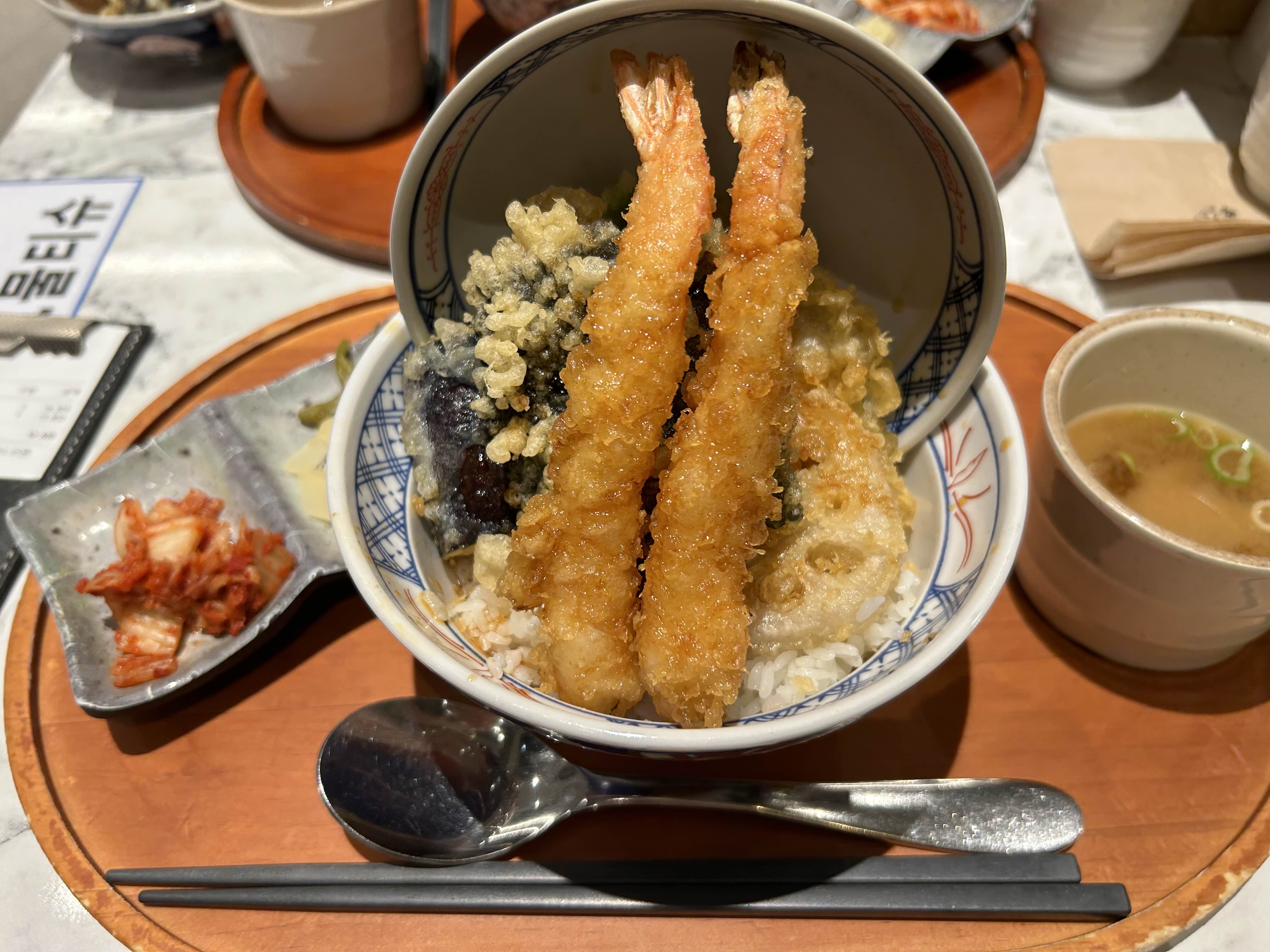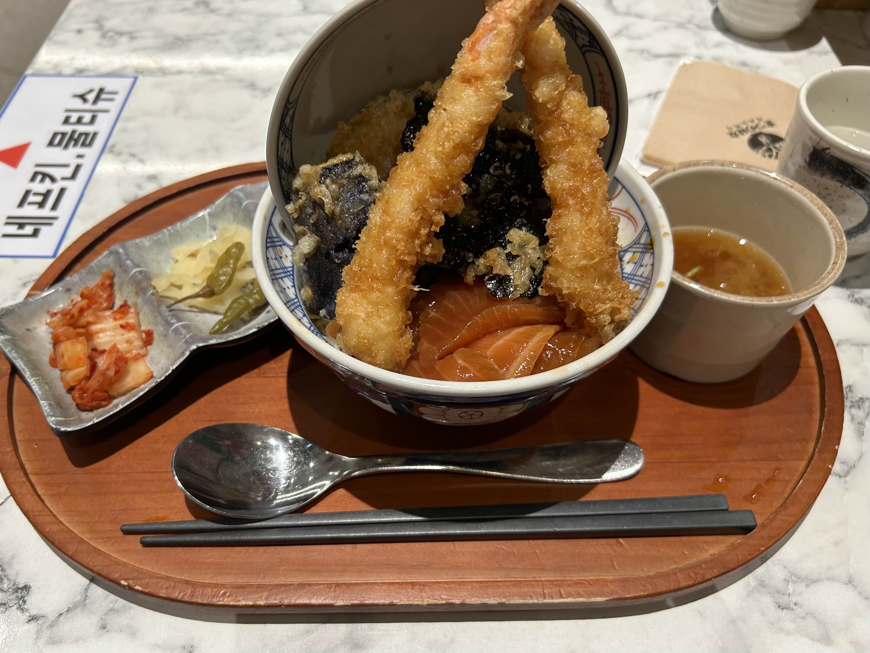 간장생연어, 새우2, 온천계란1, 단호박1, 가지1, 연근1, 꽈리고추1, 김1 이렇게 총 8가지 구성으로 이루어진 텐동입니다. 한 그릇에 아주 푸짐하게 들어가져 있어요. 그리고 간단한 반찬들과 미소국물이 제공됩니다.