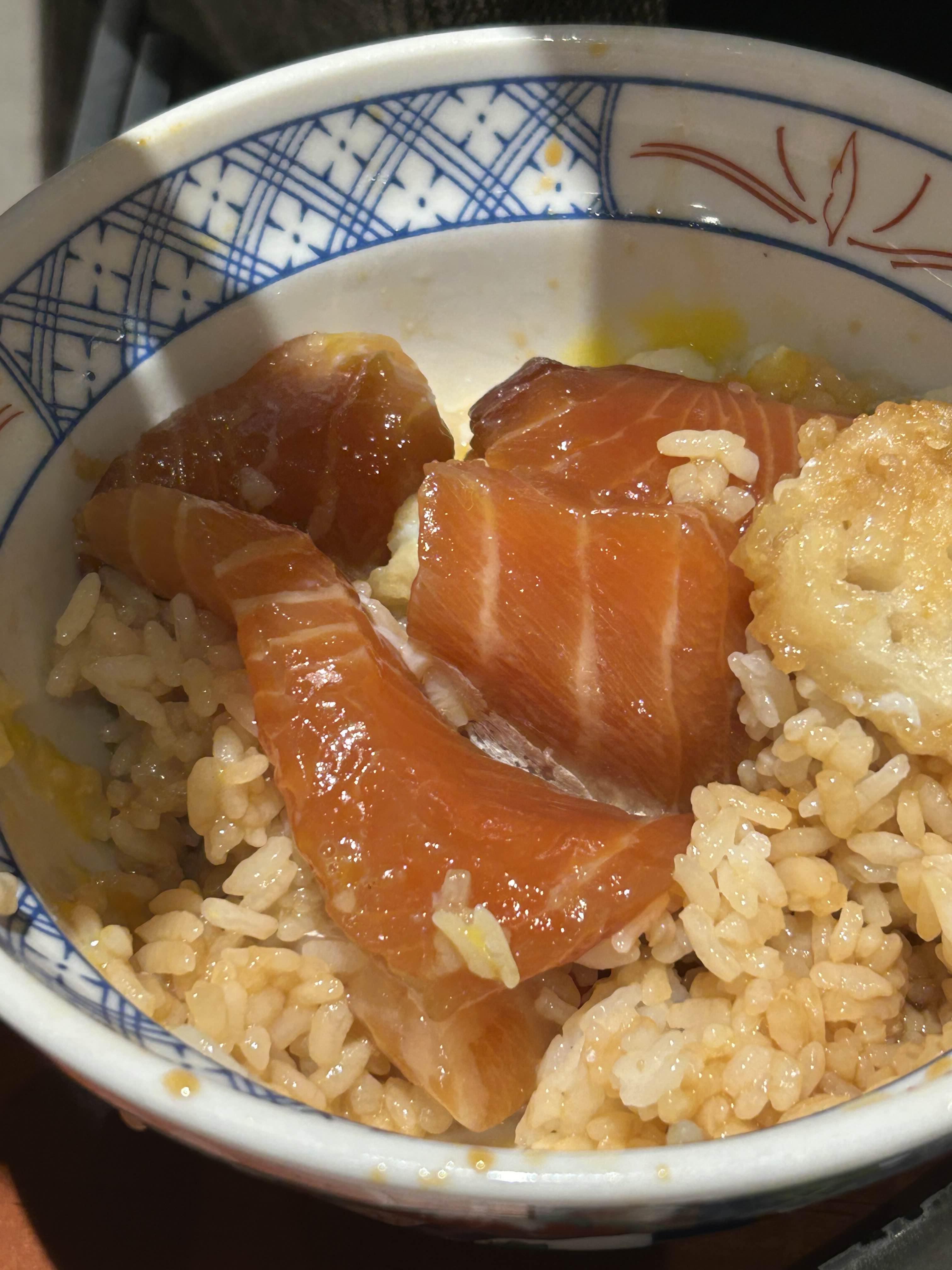 연어텐동 답게 연어와 계란반숙을 터트려 슥슥 비벼서 바로 먹으니 너무 맛있었습니다. 따뜻한 밥위에 노른자가 들어가니 정말 버터만큼 부드럽고 고소한 맛이었고 간장생연어는 밥과 간이 아주 혼열일체를 이루어지게 해줘서 조화가 꽤 좋았습니다. 먹어도 먹어도 먹고싶은맛 딱 그맛이에요.