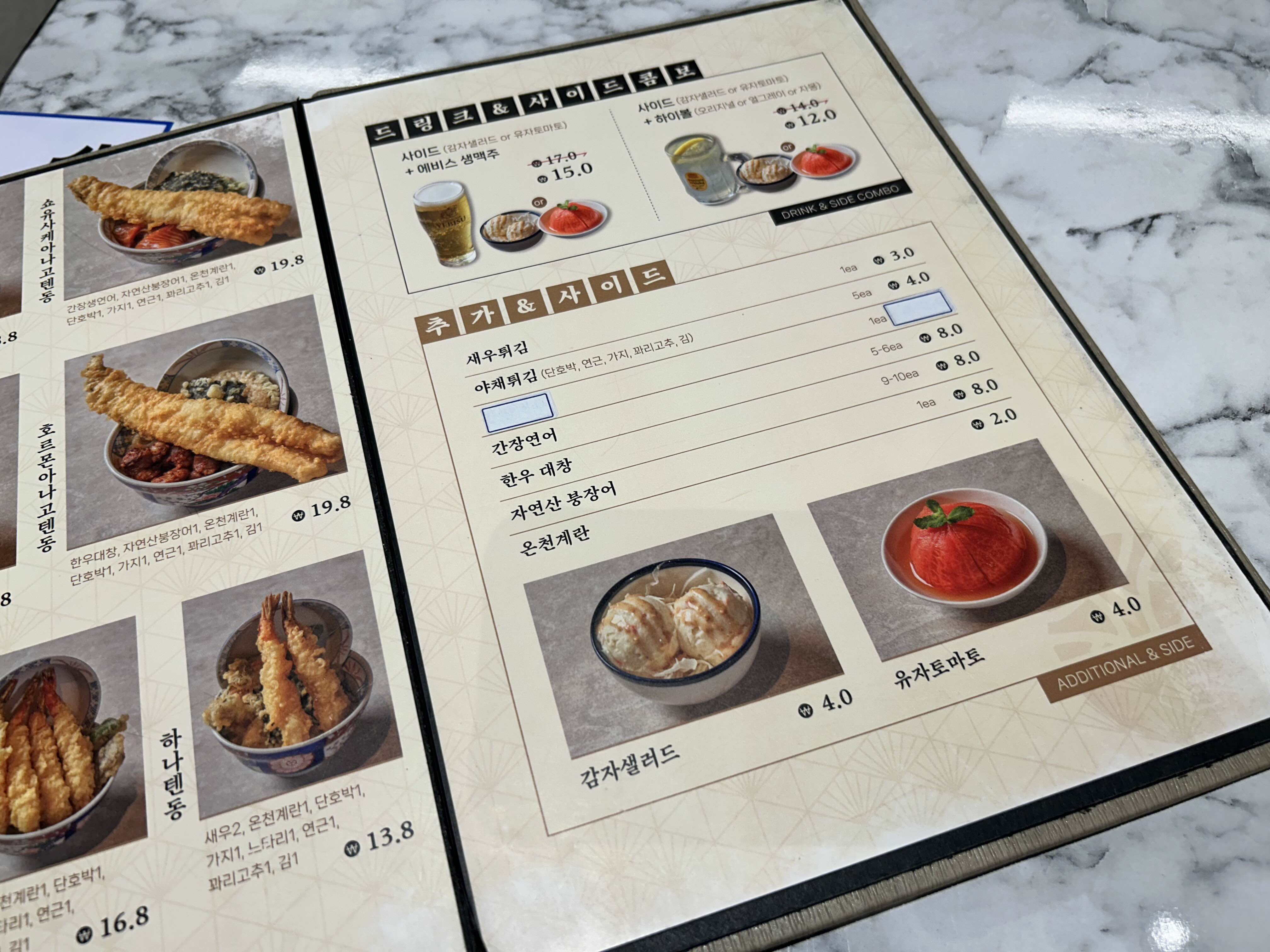 대기 2팀이 남았다는 카톡을 보고 바로 달려와 직원분 안내로 바로 착석했습니다. 기본 텐동 메뉴들인데 위에 올라가져있는 것들에 따라 가격이 다르고 야채들은 비슷하게 들어가는것 같습니다.