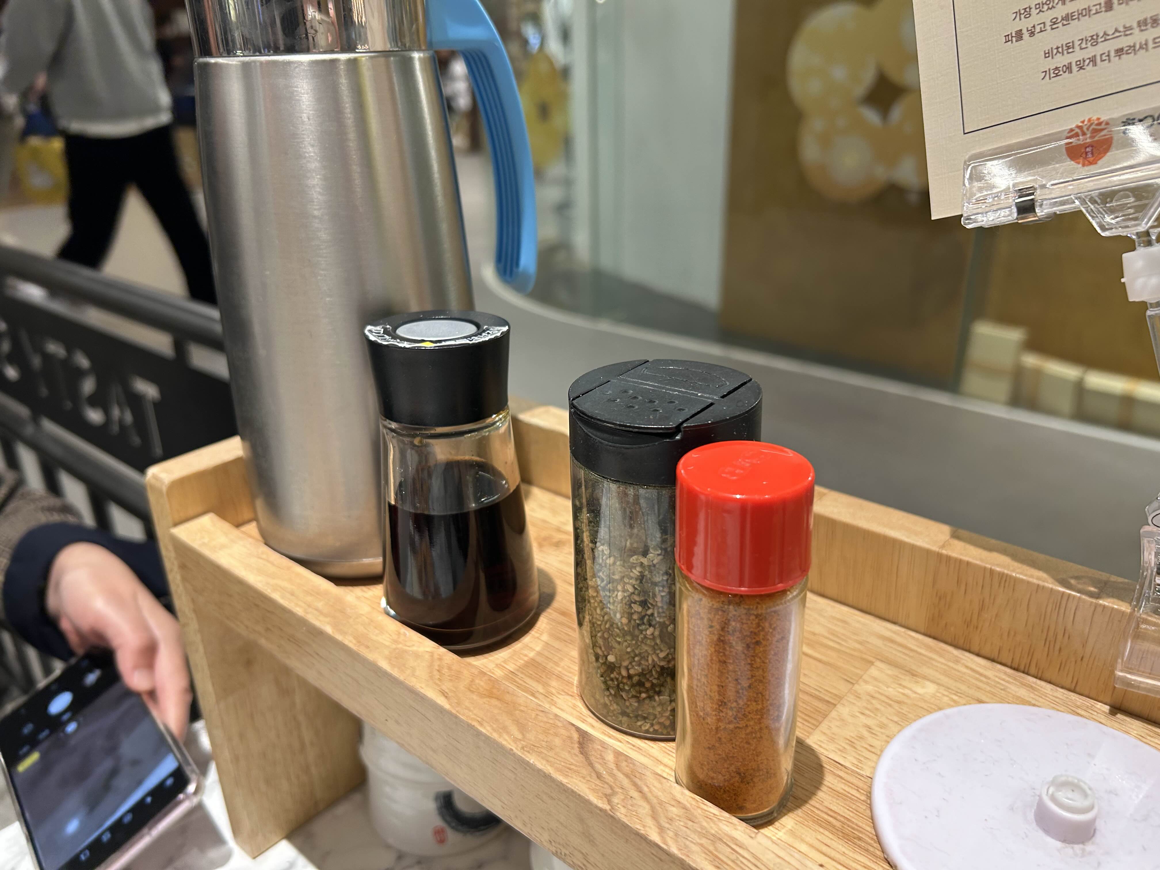 테이블에는 간장들과 파우더형 소스가 있었고 물과 컵들이 셋팅되어 있습니다. 저희가 자리에 앉았음에도 불구하고 계속 웨이팅 예약을 하고 있던데 인기가 정말 많은곳에 왔더라구요. 심지어 이 시간대가 오후 1시가 다되는 시간이었거든요.