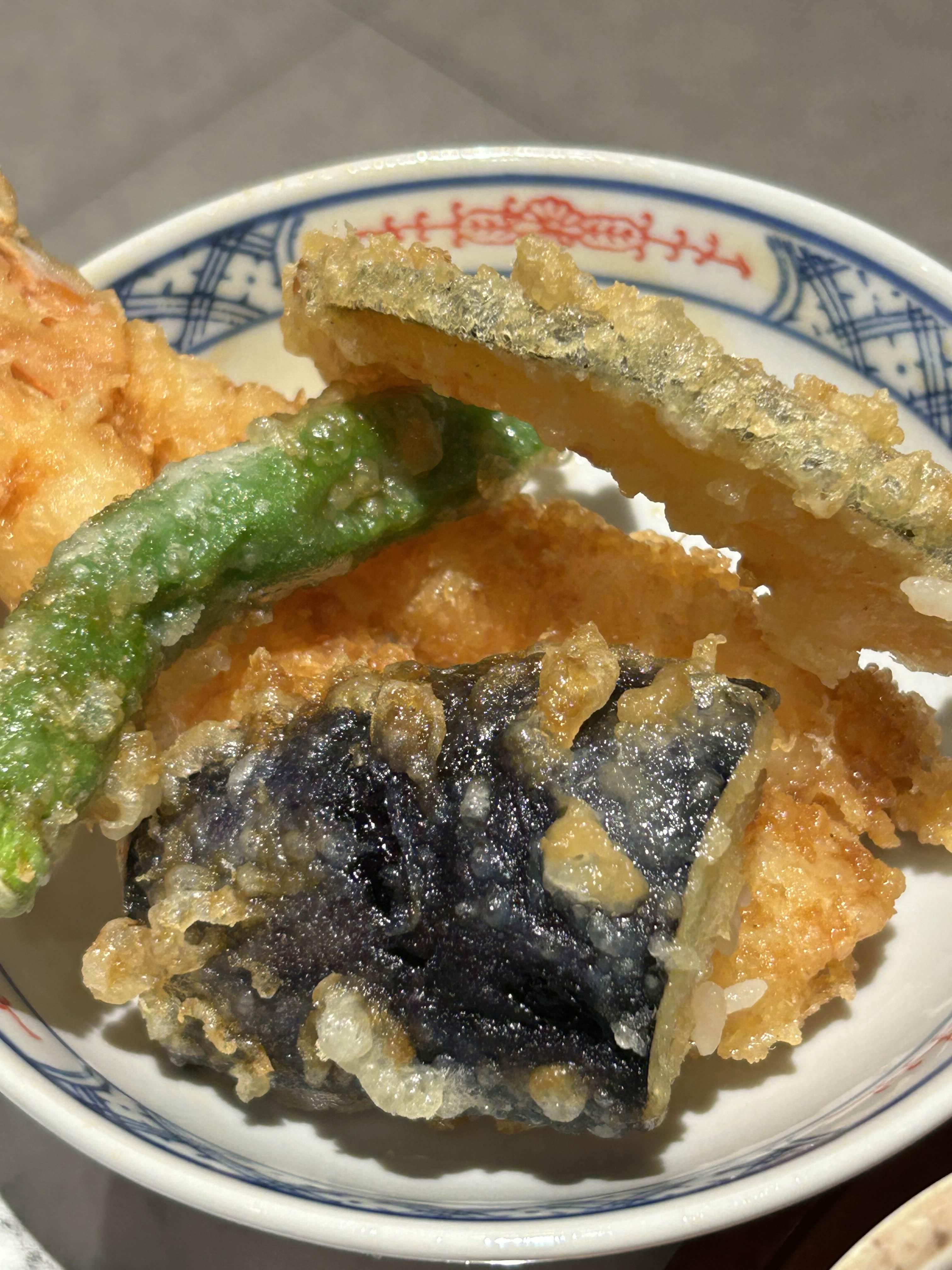 노릿노릿하게 튀겨진 튀김들을 덜어내고 연근과 가지를 먹어보았는데 식감이 괜찮더라구요. 엄청 바삭하지 않지만 부드럽고 맛있는 식감입니다.