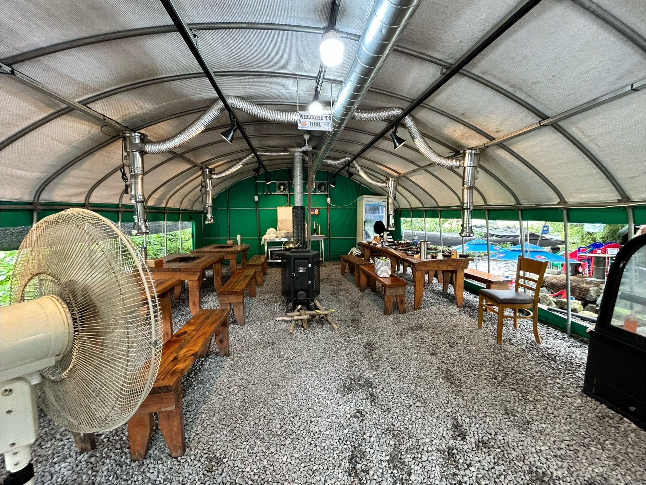 식사도 다 마치고 이제 가려고 나서는데 그냥 한번 찍어본 실내입니다. 자갈밭이라 어디 캠핑온 느낌이 들고 바로옆이 물가라 심하게 덥진 않았습니다. 나름 계곡물에 발도 담그고 도란도란 이야기도 나누면서 시원하게 잘 놀다왔네요.