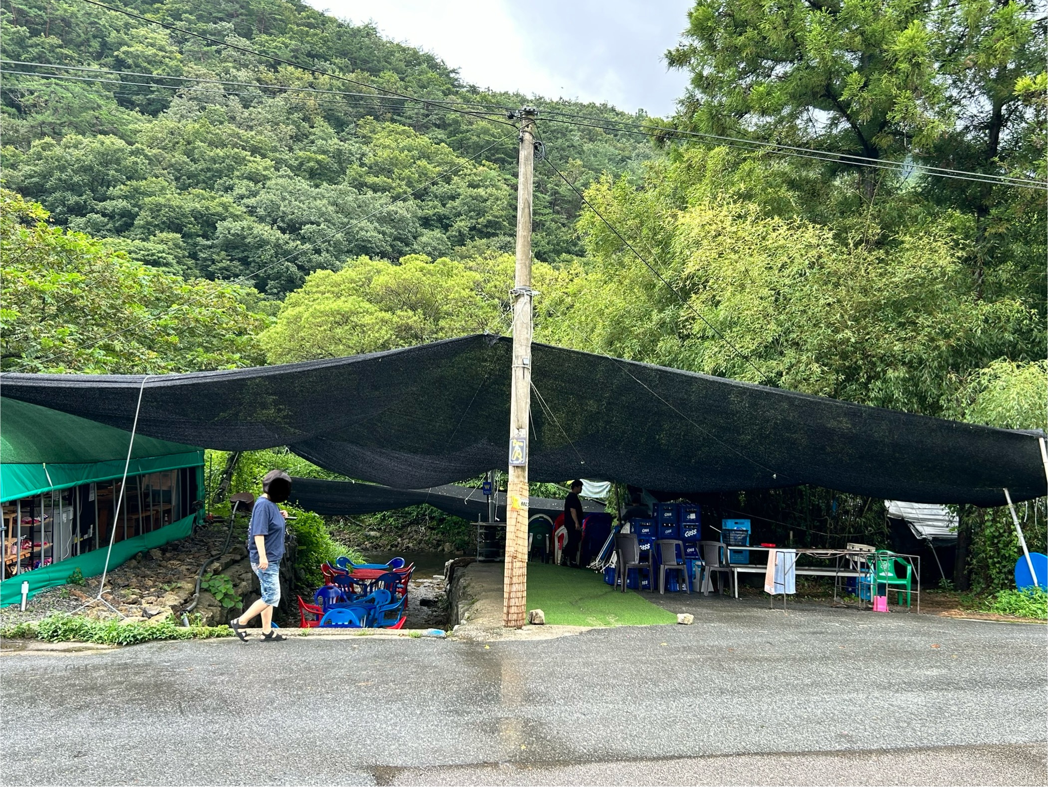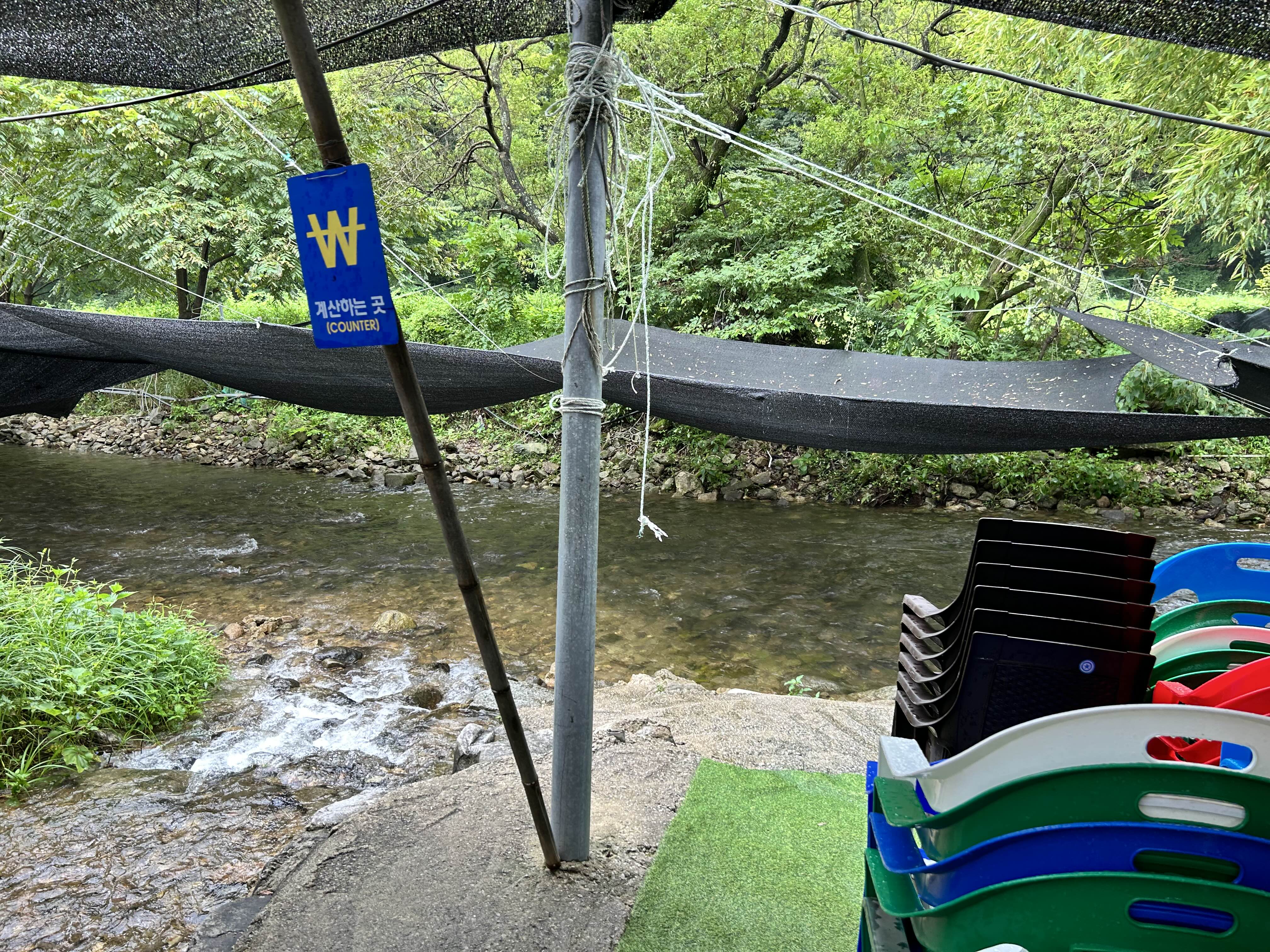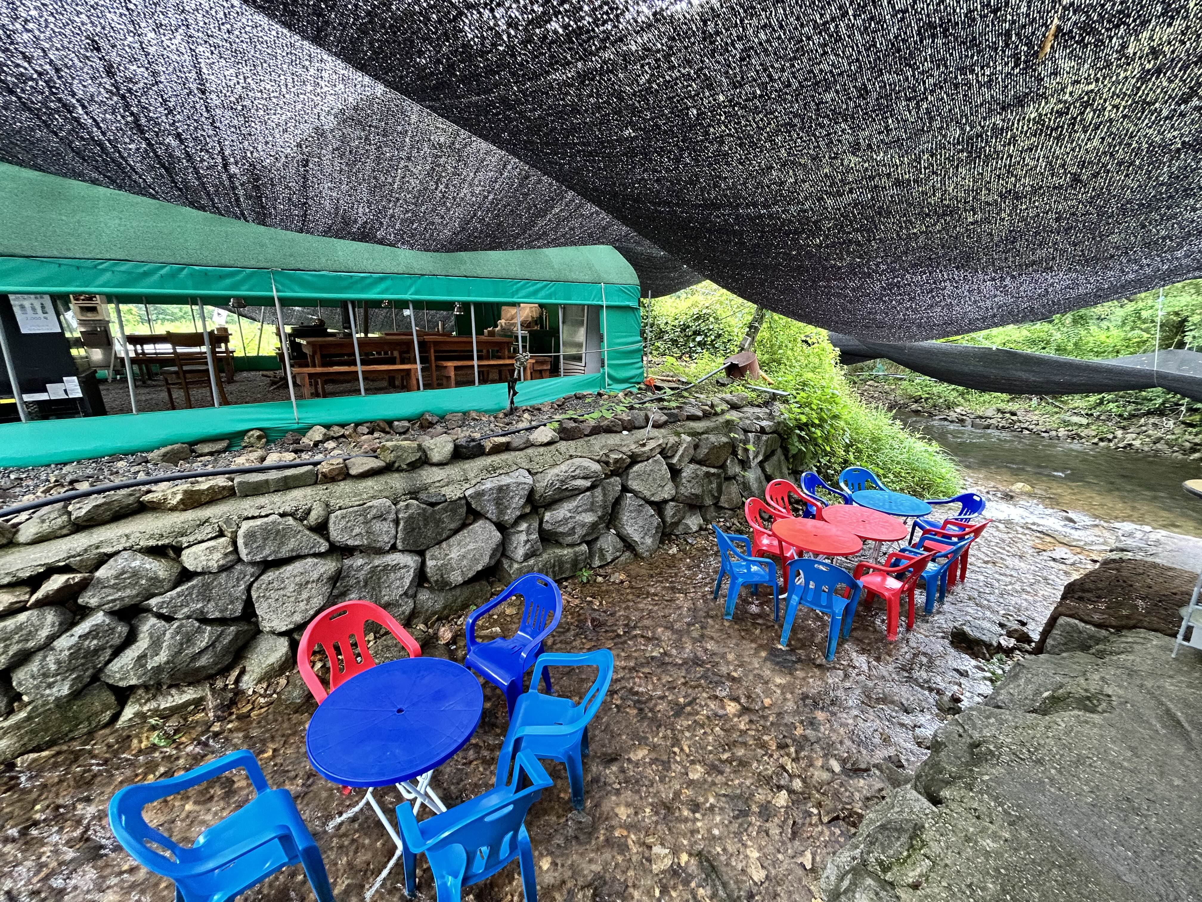 밑으로 내려가다보면 바로 시원하게 물이 흐르는 계곡이 나옵니다. 완전 명당이 따로없더라구요. 이날은 며칠전부터 비가 좀 와서인지 물이 좀 있는편이라 윗부분은 테이블을 다 치우시고 물이 적은곳에만 테이블을 놓으셨어요.