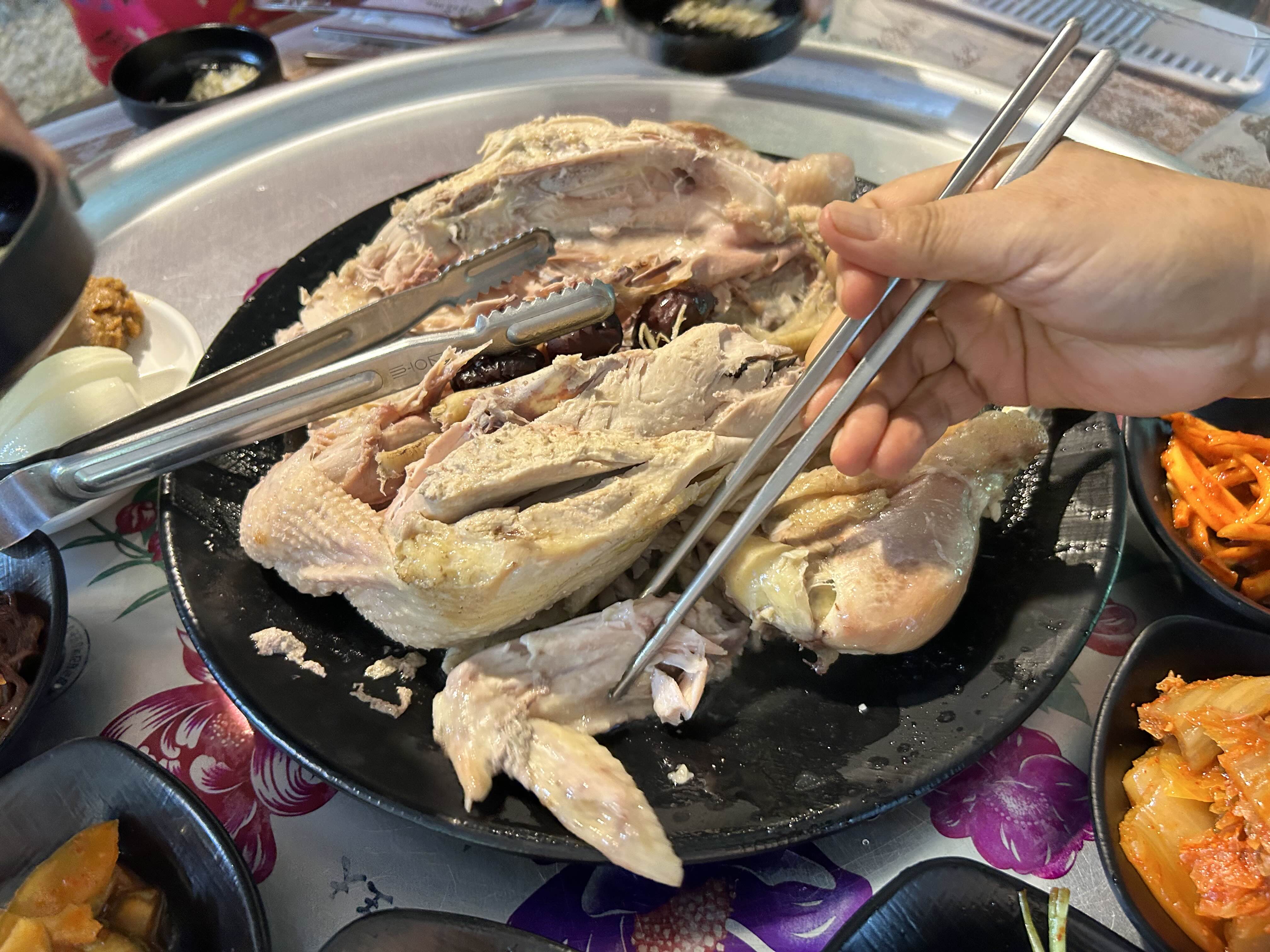 다음은 백숙입니다. 백숙도 큰 닭으로 삶은거라 가슴부위 쪽은 좀 퍽퍽하더라구요. 그래도 냄새안나고 야들한 살 부위만 골라먹으니 먹을만 했습니다. 닭이 큰편이라 서서 분해 해야 하는데 닭 자체는 엄청 실해요.