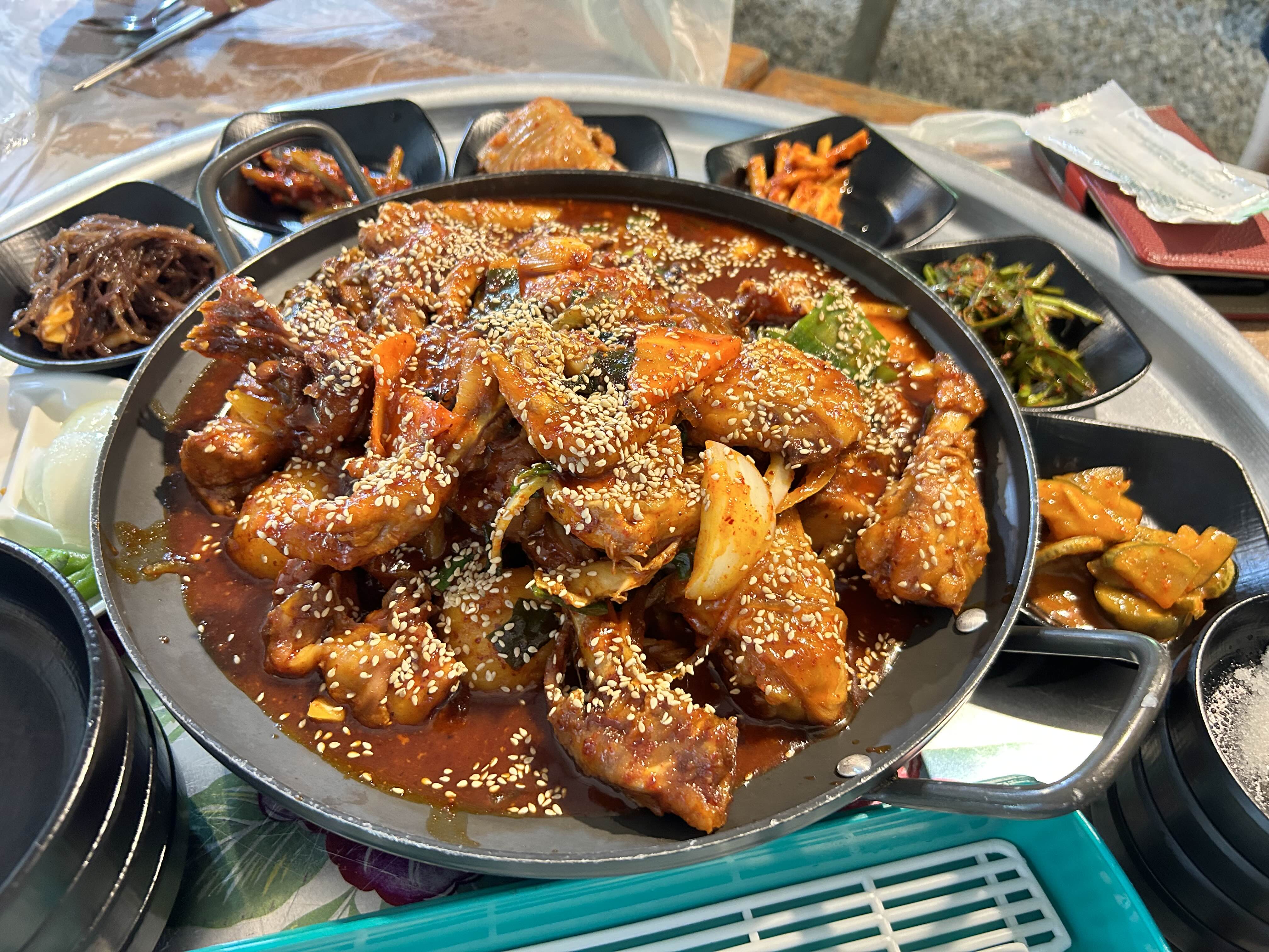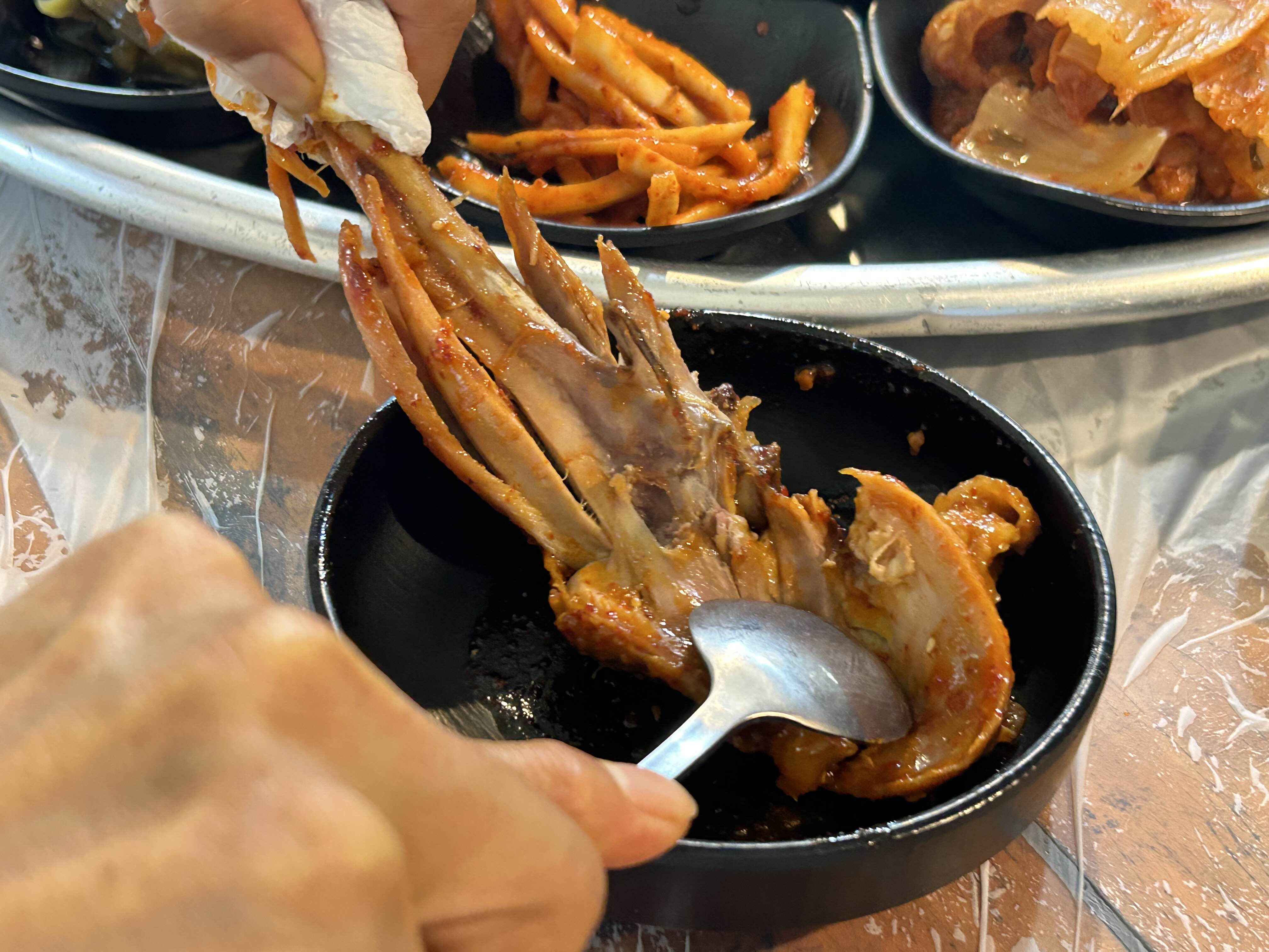 닭다리를 뜯어서 먹는데 꽤 큽니다. 장닭을 쓰셨나봐요. 닭다리파인 저는 정말 맛있게 먹었습니다. 살도 쫄깃하고 양념이 겉돌지않고 맛있더라구요.