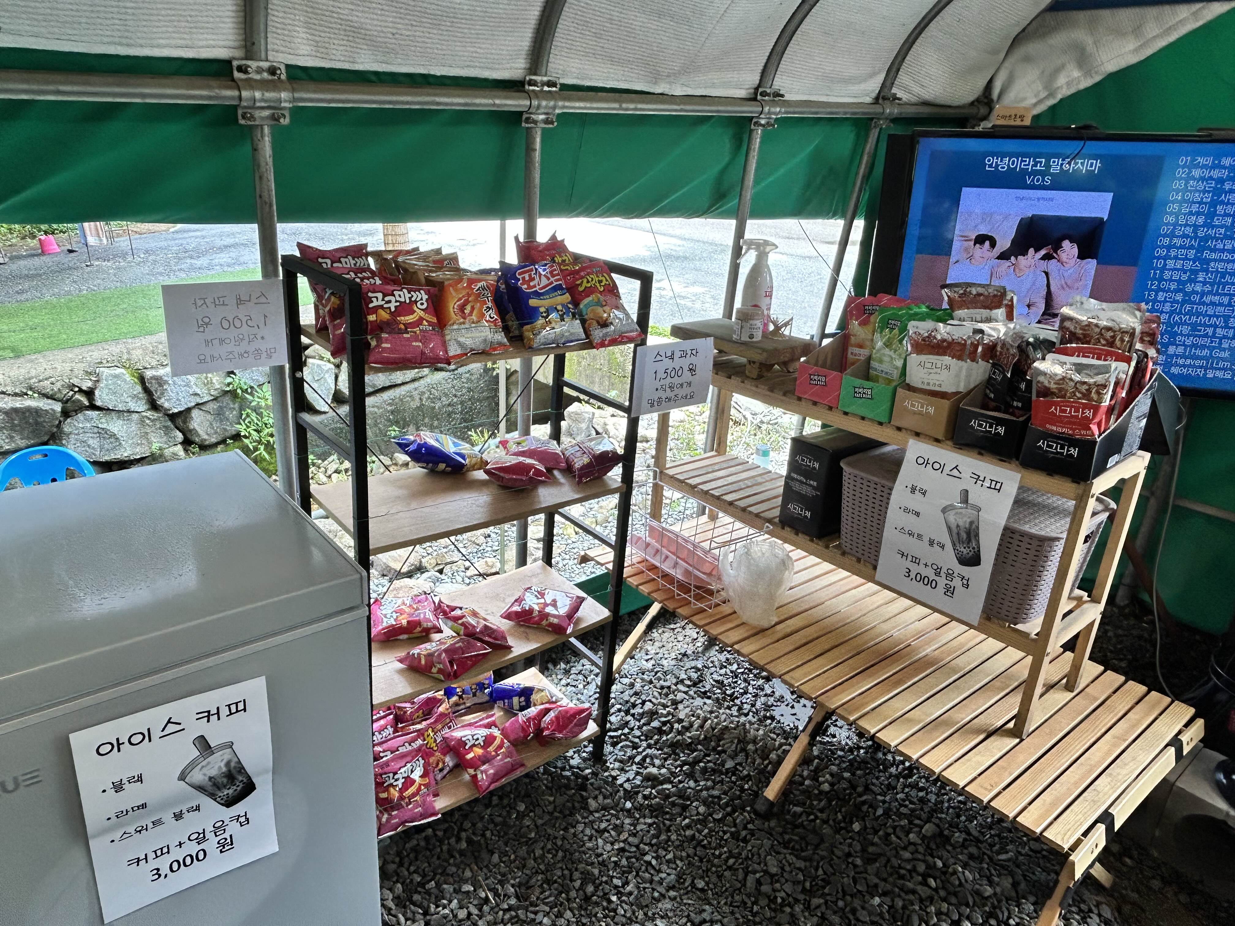 저희는 발 담그고 물에서 먹으려는데 비가 갑자기 내리는 바람에 윗쪽에 마련된 실내로 들어왔거든요. 이렇게 노래도 나오고 간단히 사먹을수있는 과자들도 판매하고 있습니다. 그리고 아이스커피까지 있어서 멀리 카페갈 필요없이 바로 해결할 수 있겠더라구요.