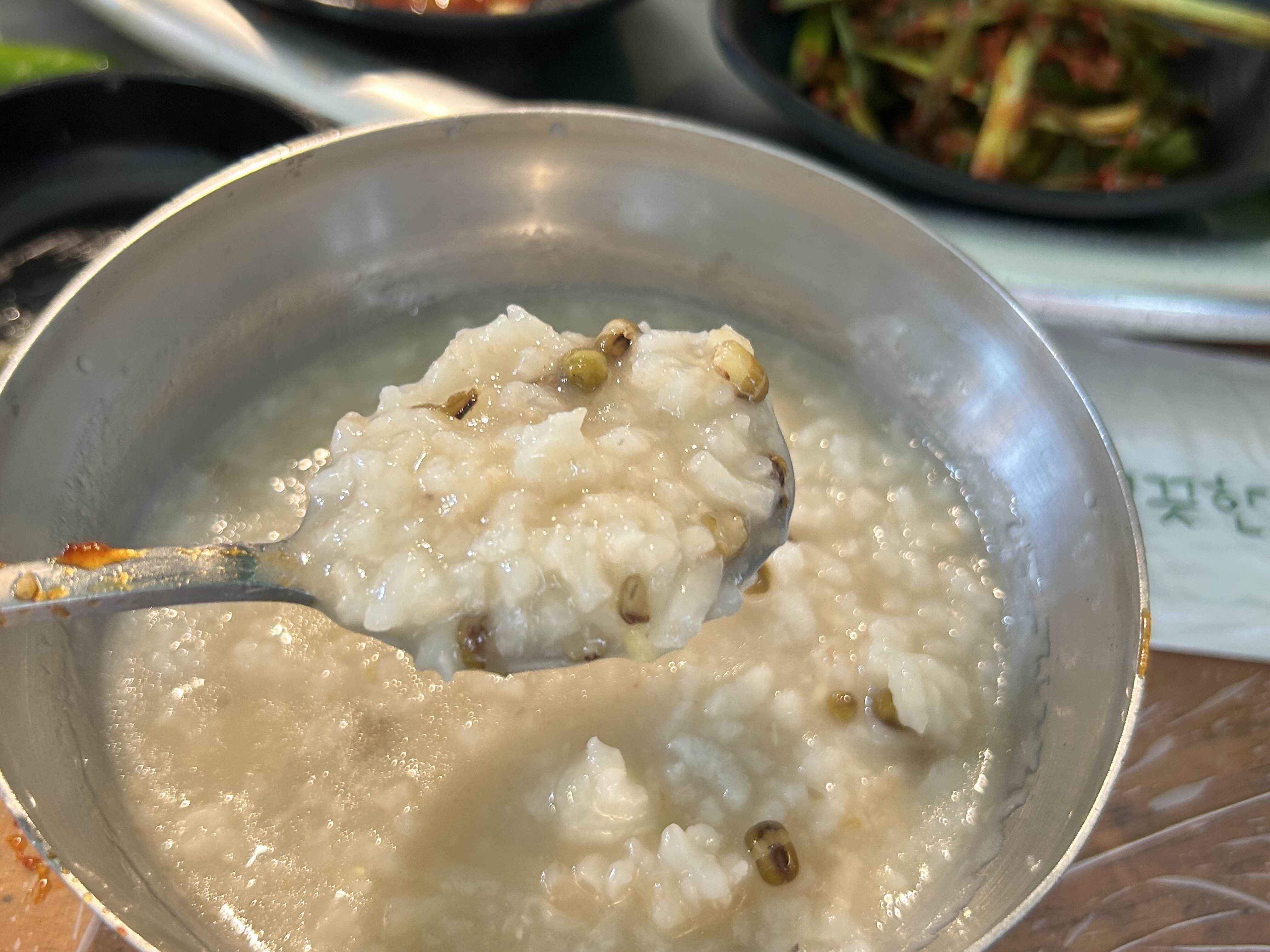 닭을 거의 먹어갈때쯤 죽을 달라고 요청하면 가져다 주십니다. 녹두가 들어간 보양죽이에요. 담백하고 맛있어서 김치랑도 잘 어울리는 맛입니다. 더운날 보양 제대로 한것같습니다.