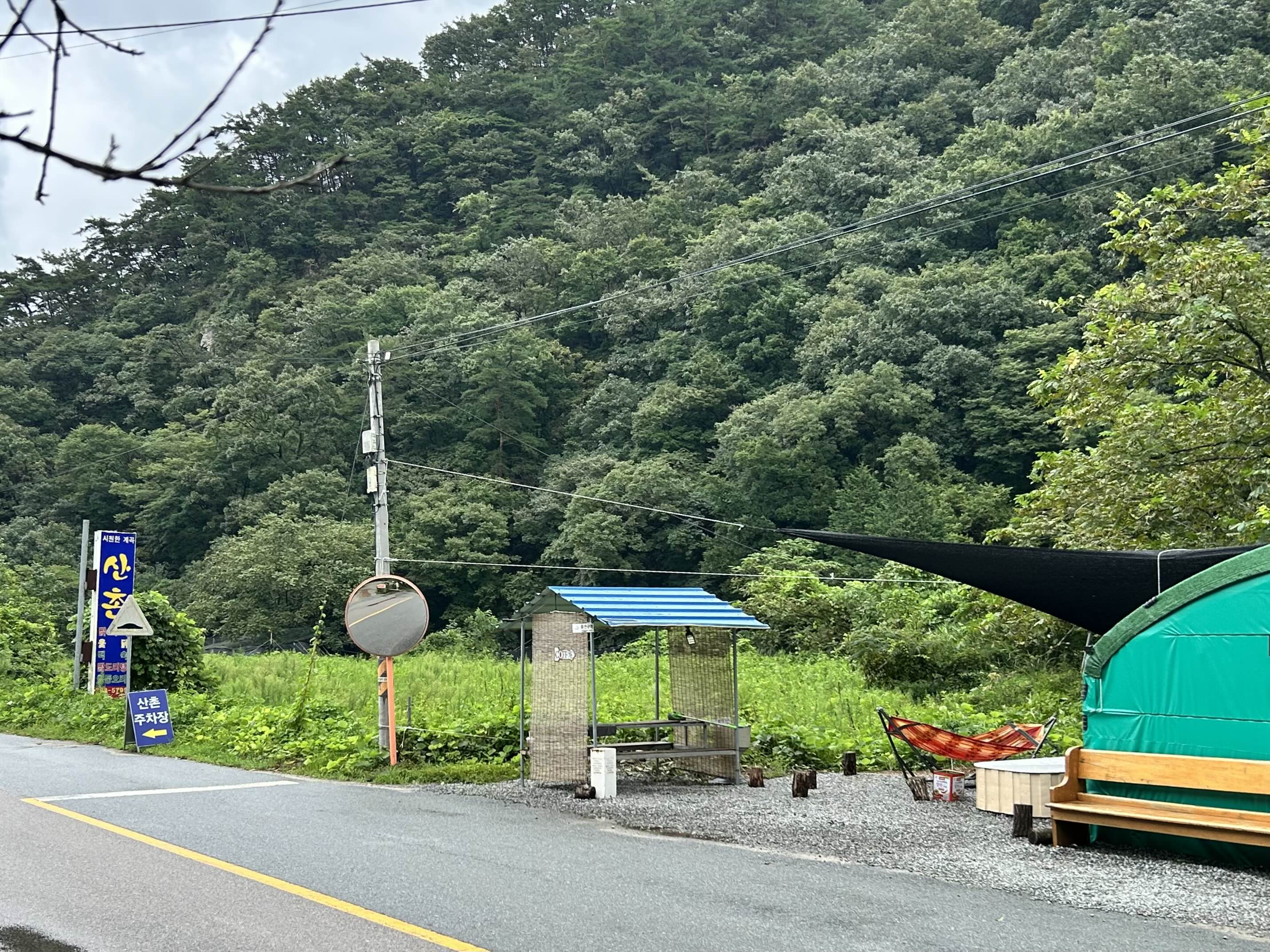 백숙집 건너편에 주차를하고 바로 건너면 산촌인데 이미 예약을 하고간터라 직원분들께서 바로 알아보시고 자리를 안내해 주시더라구요. 크게 그늘막도 쳐져 있어서 뜨거운 태양은 피할수 있어 좋았습니다.