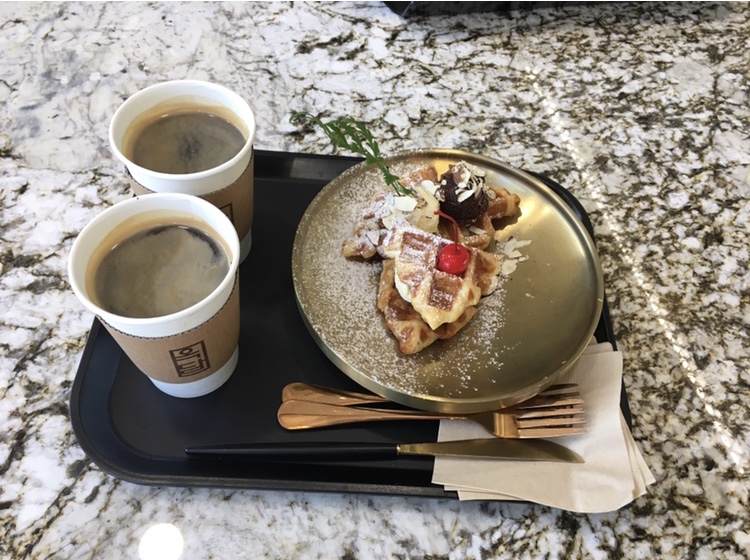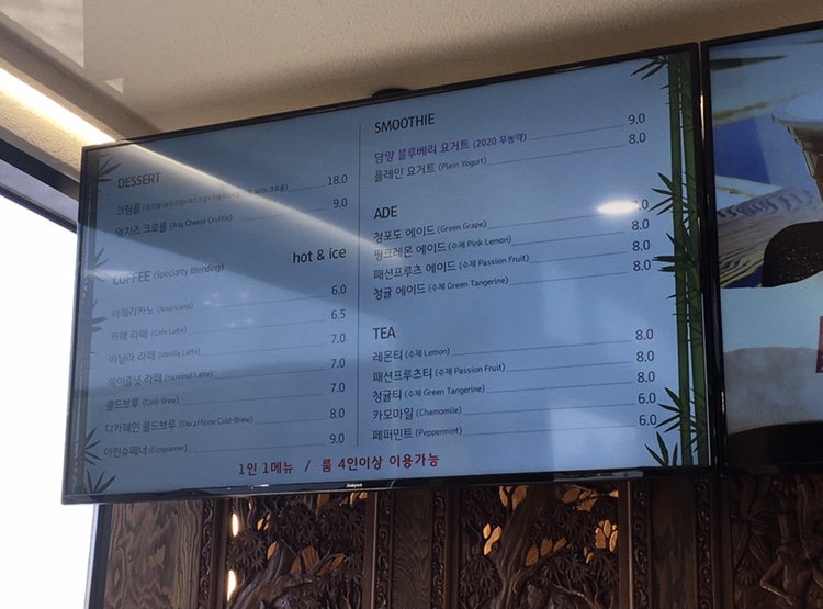 입구왼편에서 주문을 하는데요. 윗쪽모니터에 메뉴가 보여 주문하기 쉽습니다. 어딜가나 아메리카노만 마시기에 커피 두잔과 요즘 꽤 인기몰이를 하고있는 크로플을 주문했습니다.