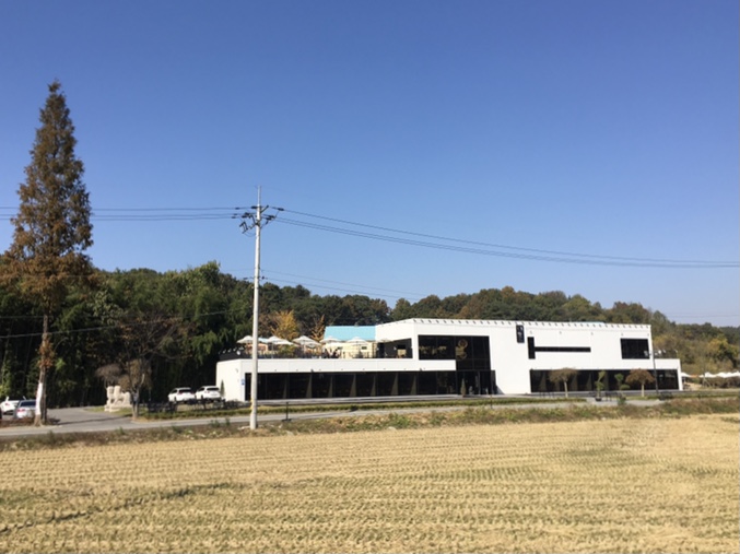 최근들어 담양에 카페가 많이 생긴터라 이제는 일일이 셀수가 없을정도입니다. 저멀리서부터 차안에서 본 관경인데요. 주변에 아무것도없는 논밭앞에 떡하니 자리잡고 있어 찾기가 굉장히 쉽습니다.