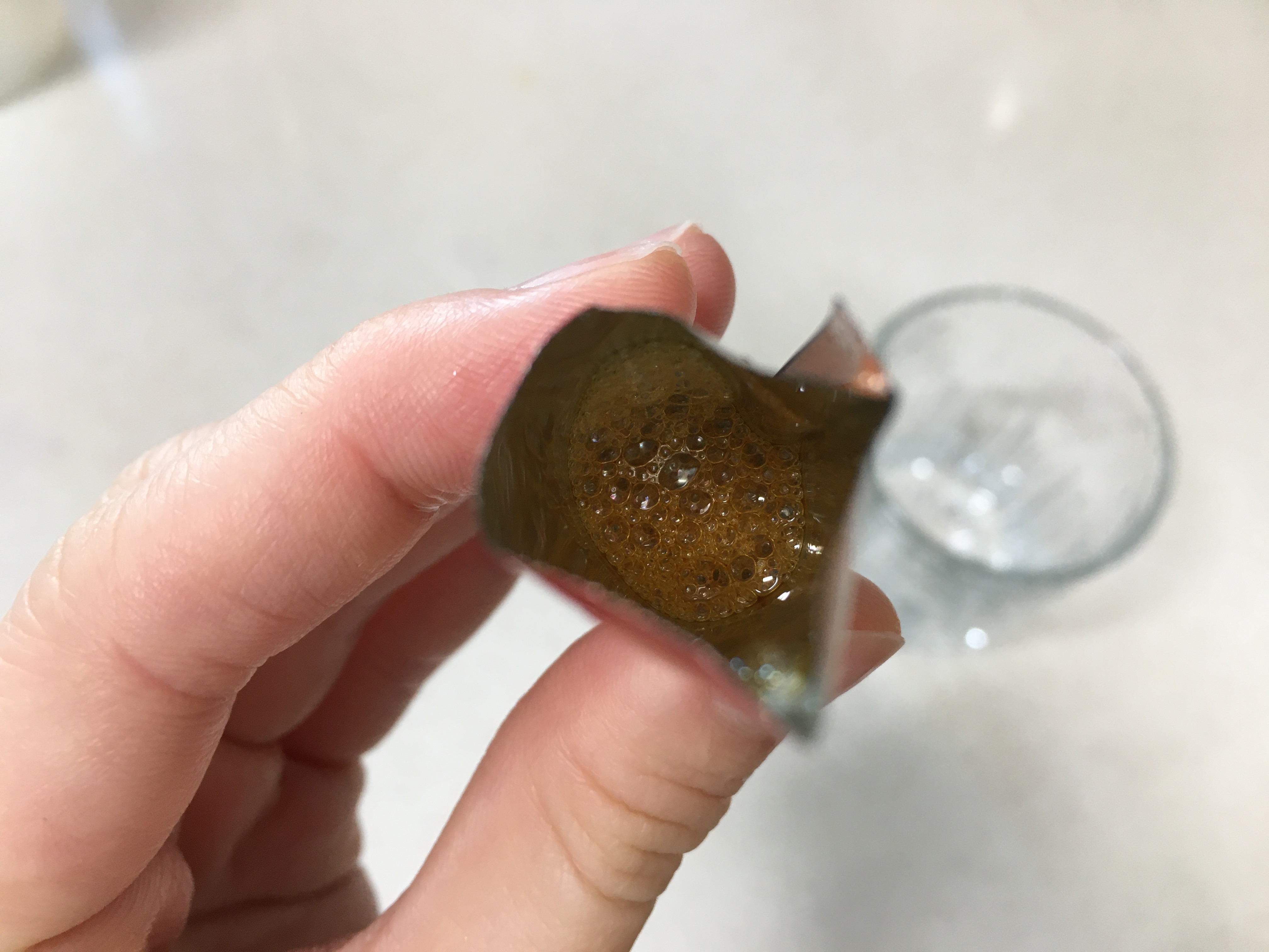 입구를 뜯고 안을 보니 갈색액체가 보입니다. 포장을 뜯기전 잘 섞이라고 마구흔들었더니 커피라떼처럼 거품이 생겨버렸네요.