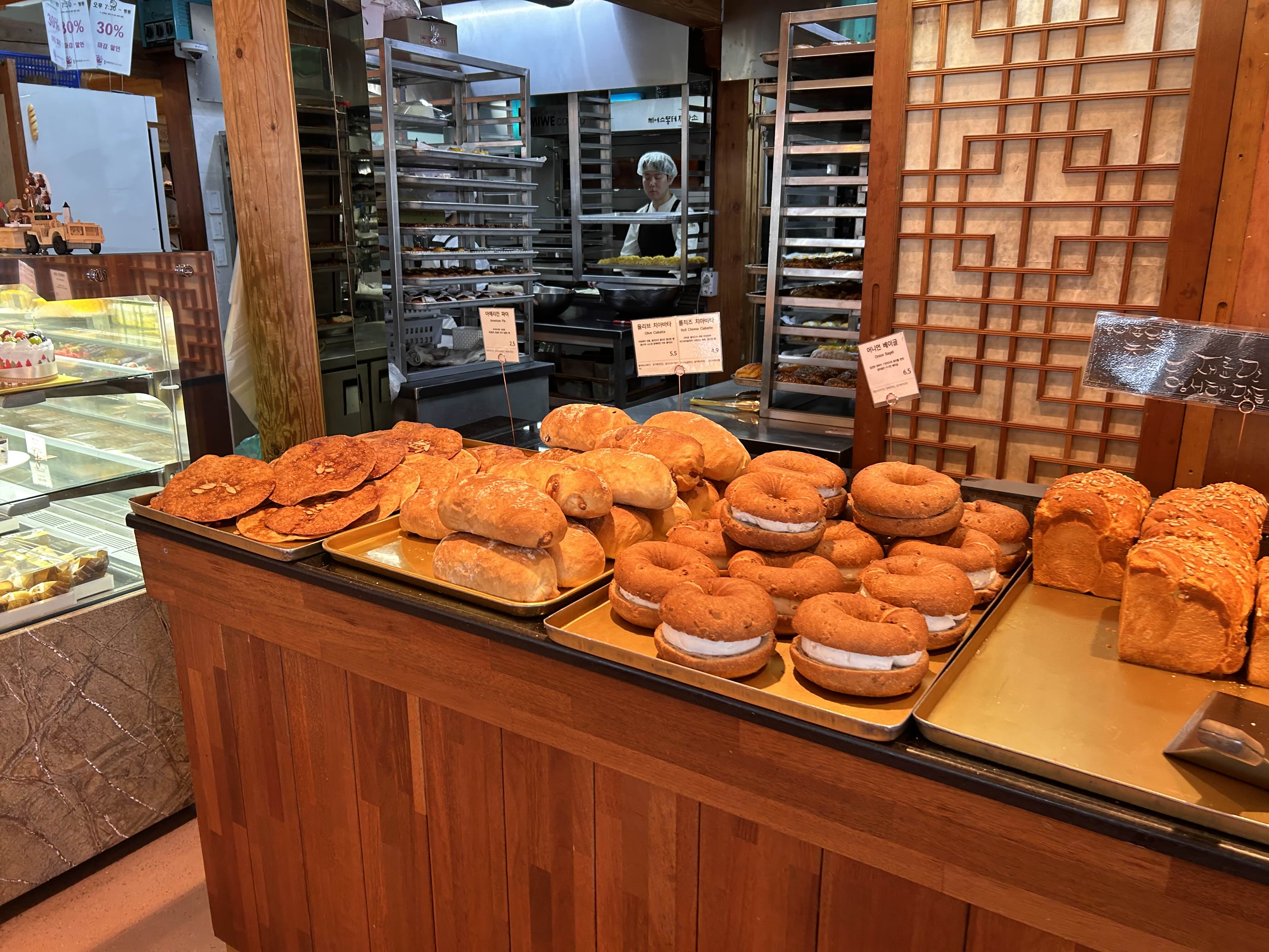 카페 내부인데 선반위에 많은 종류의 빵들이 줄지어 진열되어 있어요. 내부 인테리어도 한옥 스타일인데 빵도많고 실내도 구경하느라 정신이 없었네요.