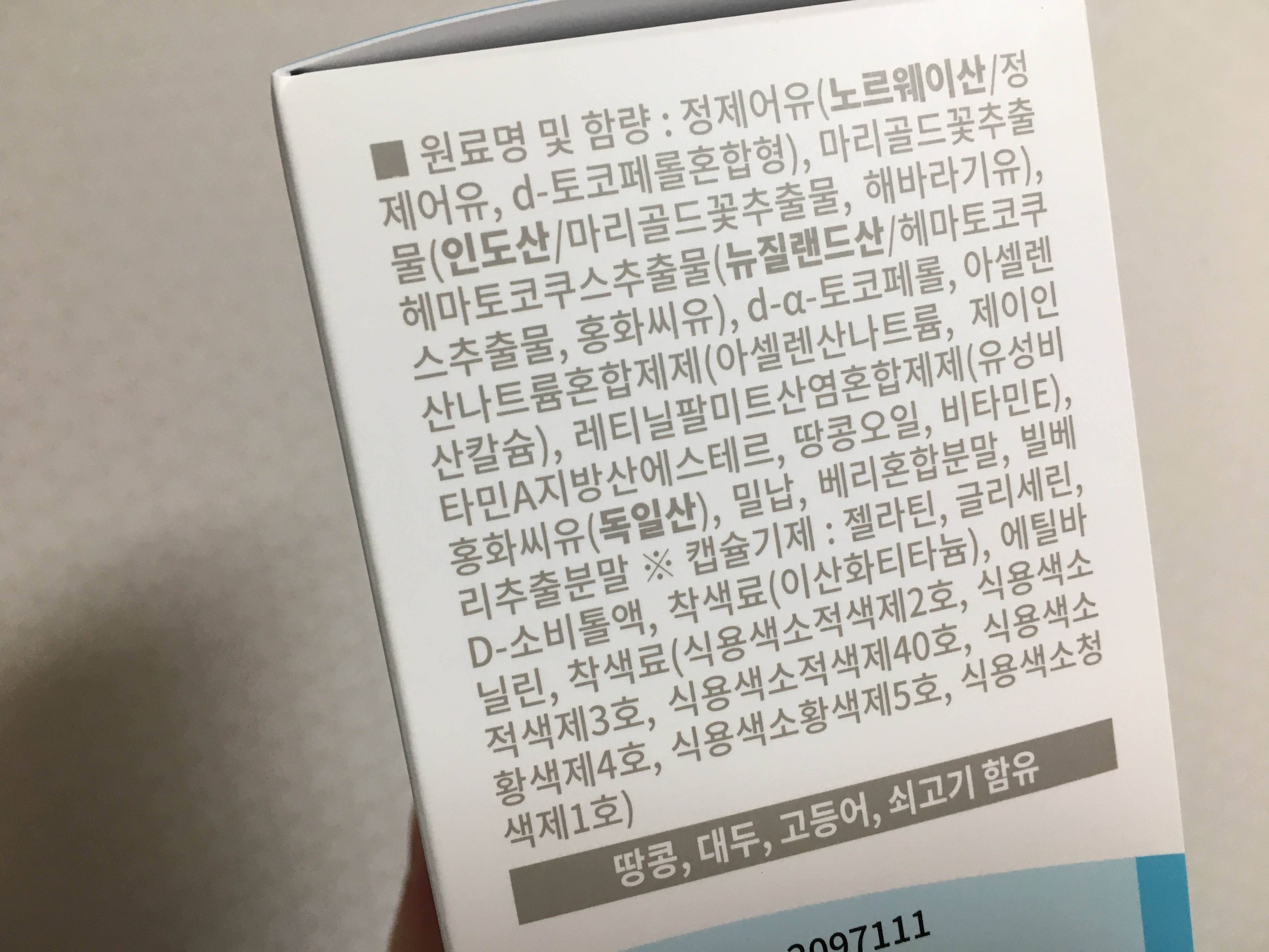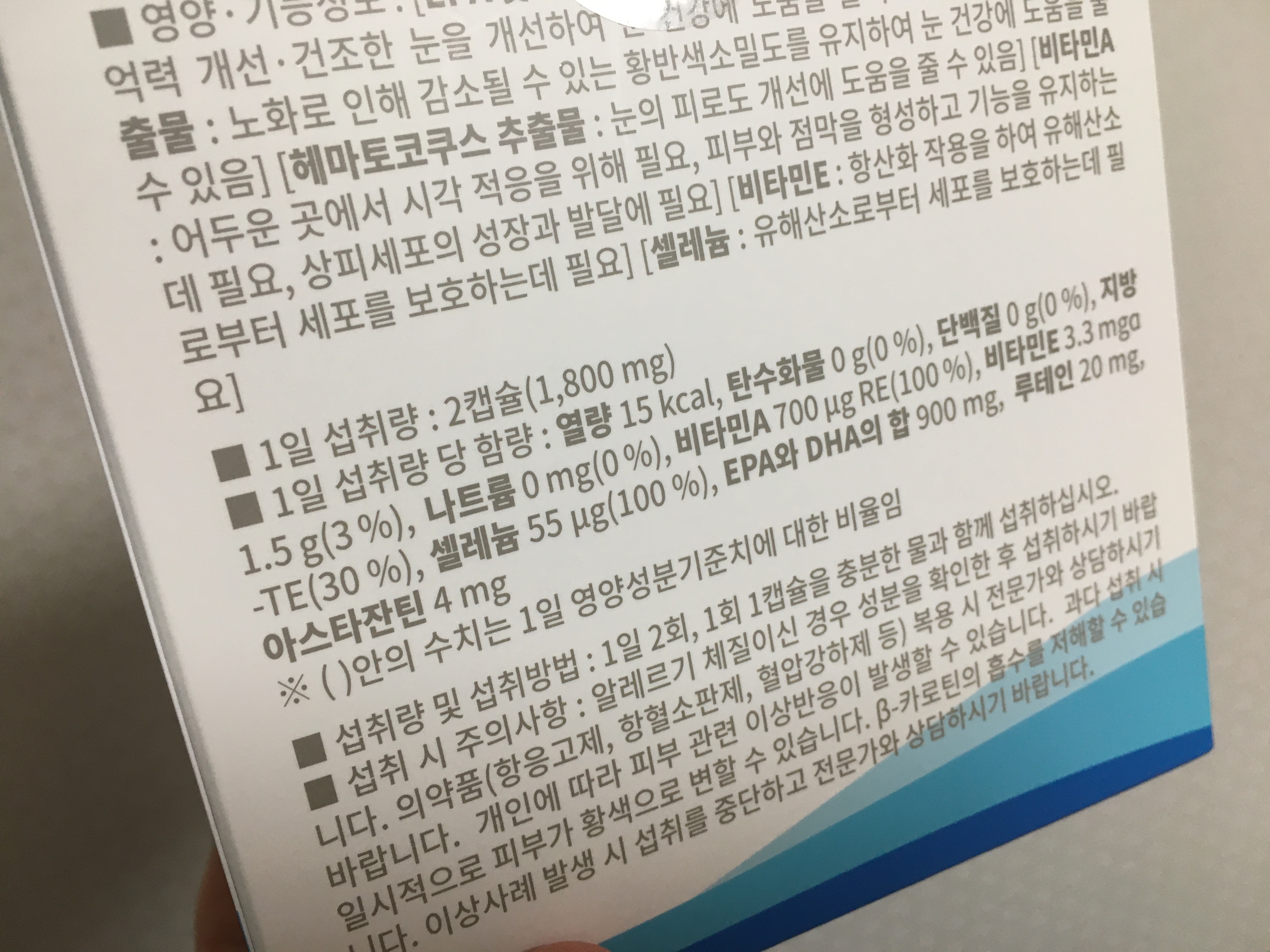 루테인 대표성분으로는 마리골드꽃추출물과 헤마토코쿠스 추출물을 보는편인데 딱 있더라구요. 거기에 오메가3까지 첨가되다니 두루두루 안먹을수 없는 제품입니다. 60캡슐로 하루기준 2알 섭취입니다.