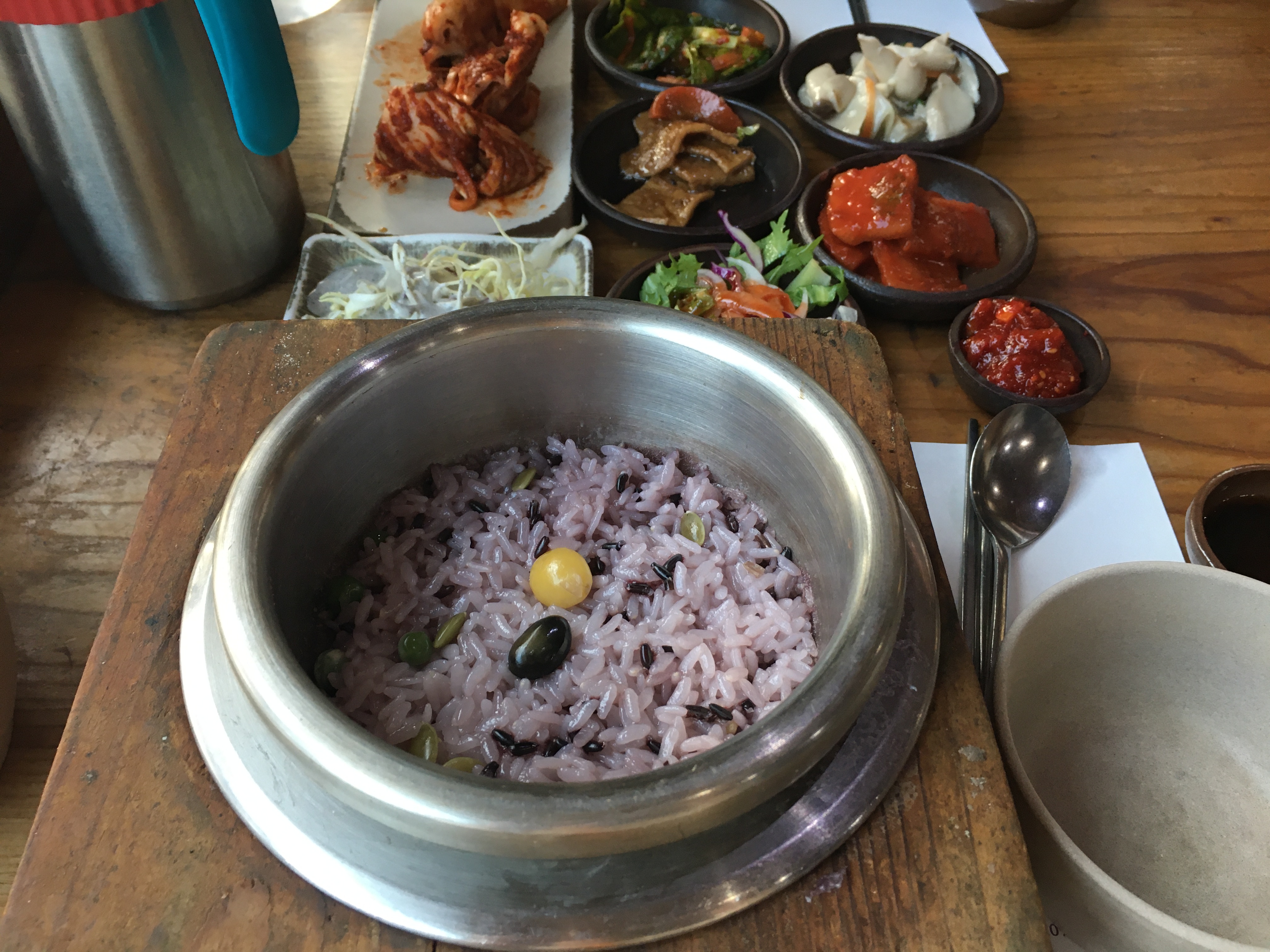 가운데 생선구이와 떡갈비를 한데 모아서 주셨고 영양돌솥밥까지 다 나온모습입니다. 너무 많이 나와서 수저통위에도 반찬을 얹어 놓은 상태라 정신이 없긴했습니다.