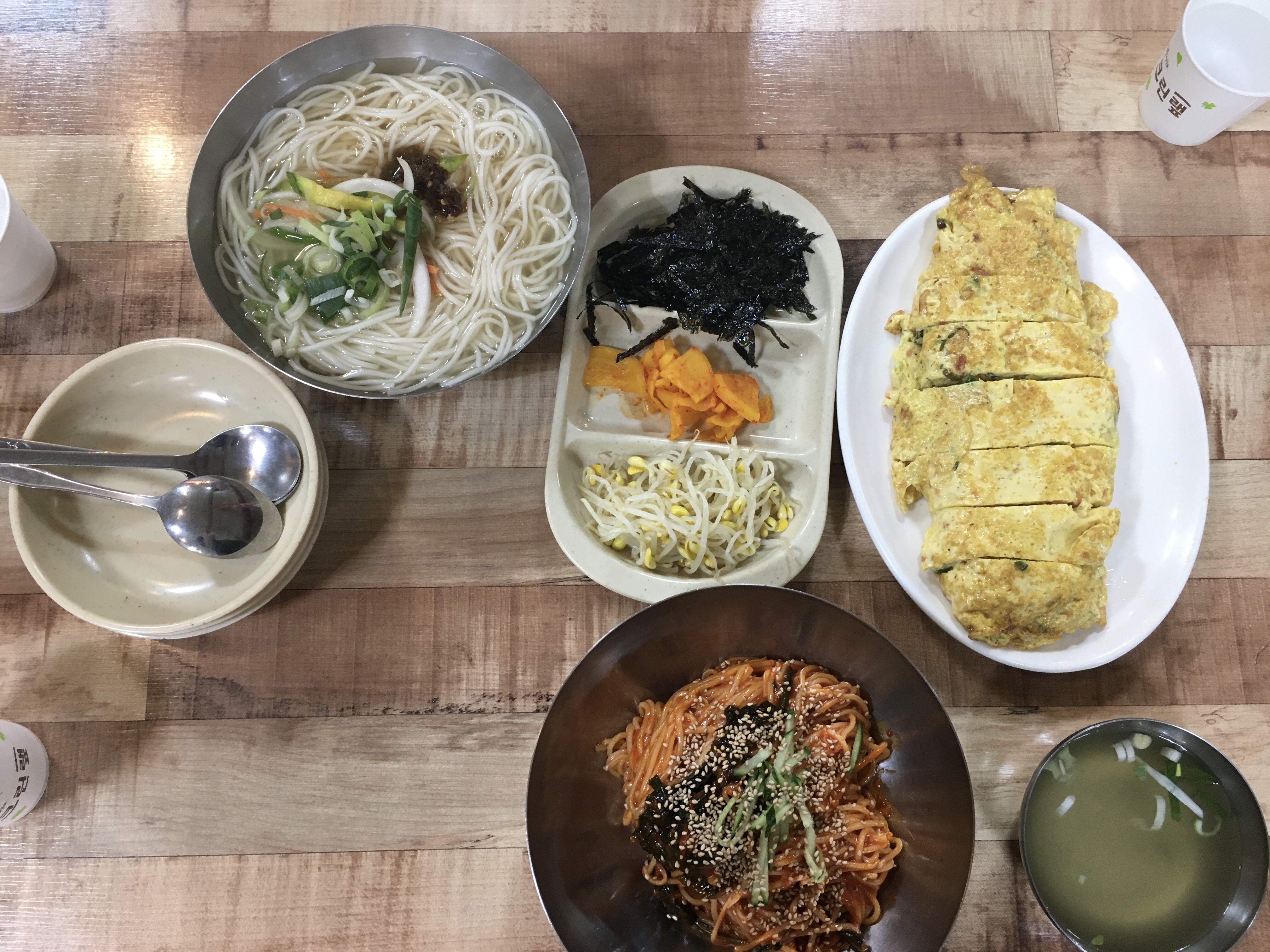다양하게 주문한 메뉴가 나왔습니다. 국수만 먹으면 아쉬우니 계란말이까지 처음으로 주문해 보았습니다. 가운데 3종반찬과 비빔국수랑 함께 곁들이기 좋은 멸치국물이 같이 나옵니다.